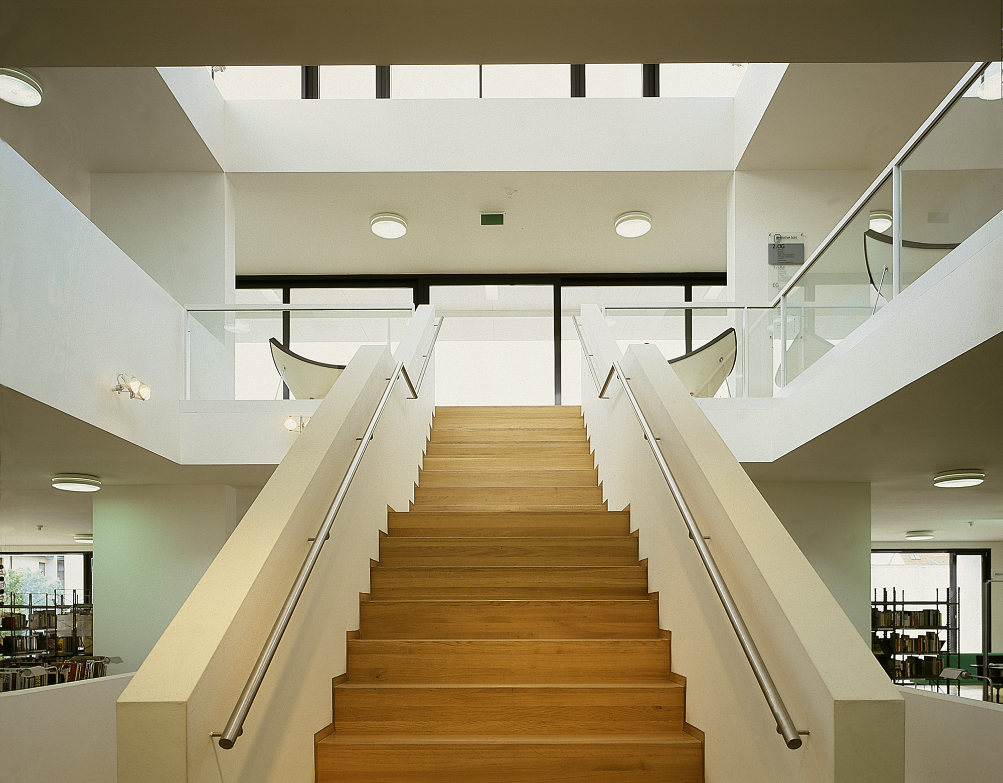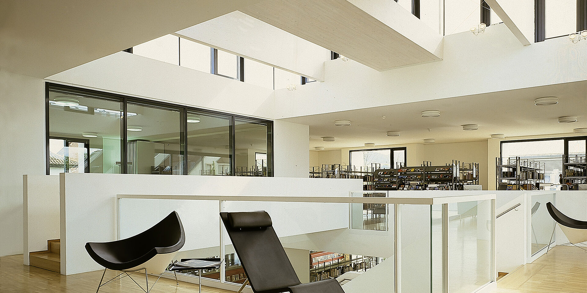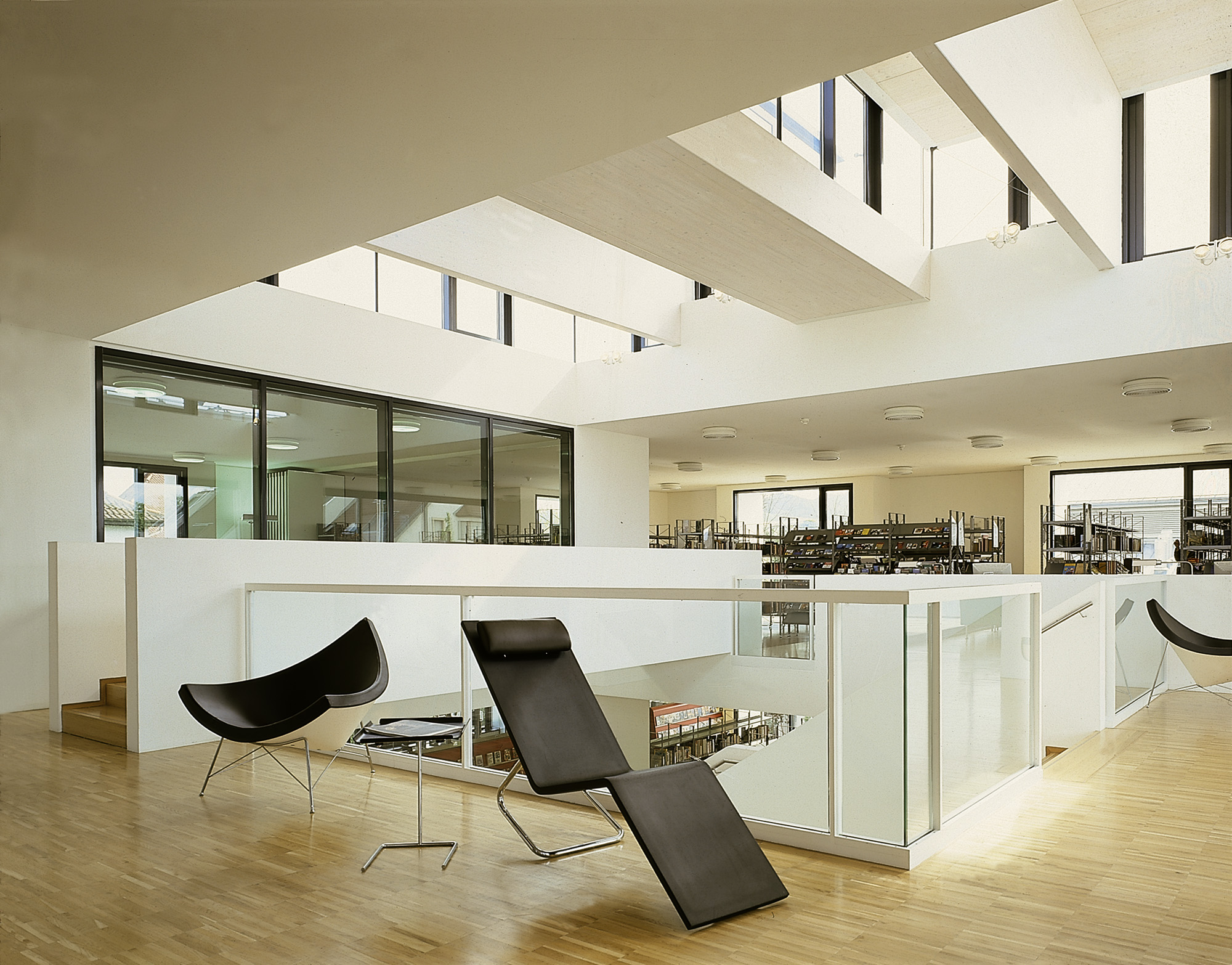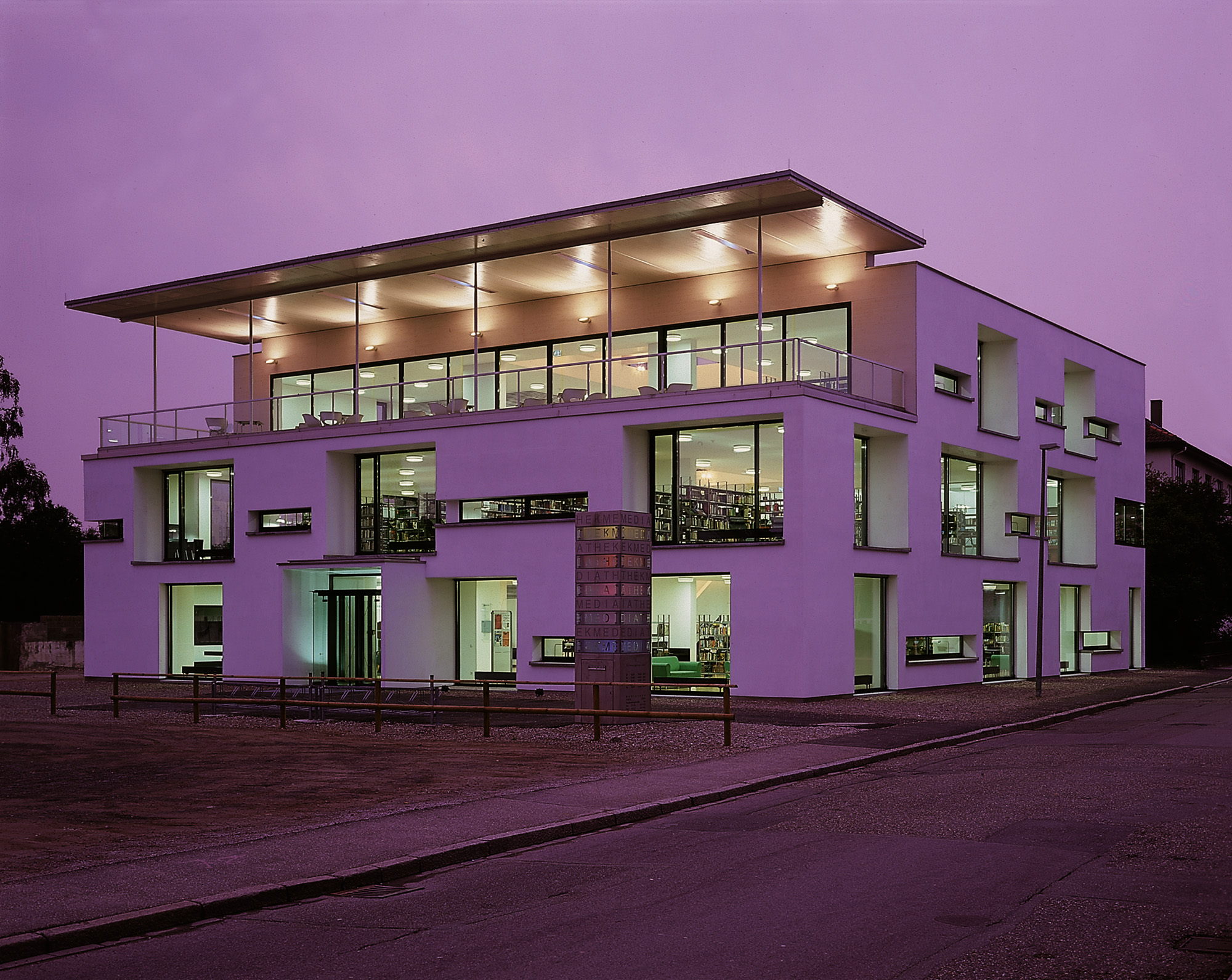 Das Objekt resultiert aus dem Gewinn eines Wettbewerbs 1998. Durch ein offenes Atrium mit Oberlicht sind die drei Ebenen der Mediathek über die Haupttreppe verbunden. Der Raum fließt auf nahezu quadratischem Grundriss die verschiedenen Bereiche des Hauses verbindend. Nach aussen ist die Fassade durch im Wechsel plastisch ausgeformte und flächenbündig gesetzten Fensteröffnungen gegliedert.