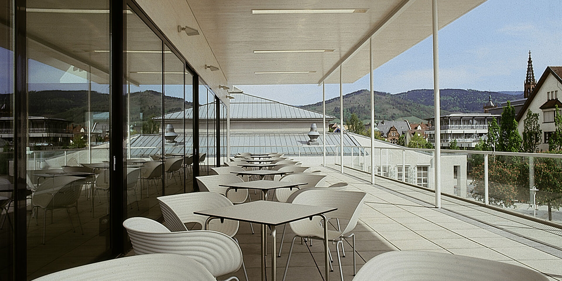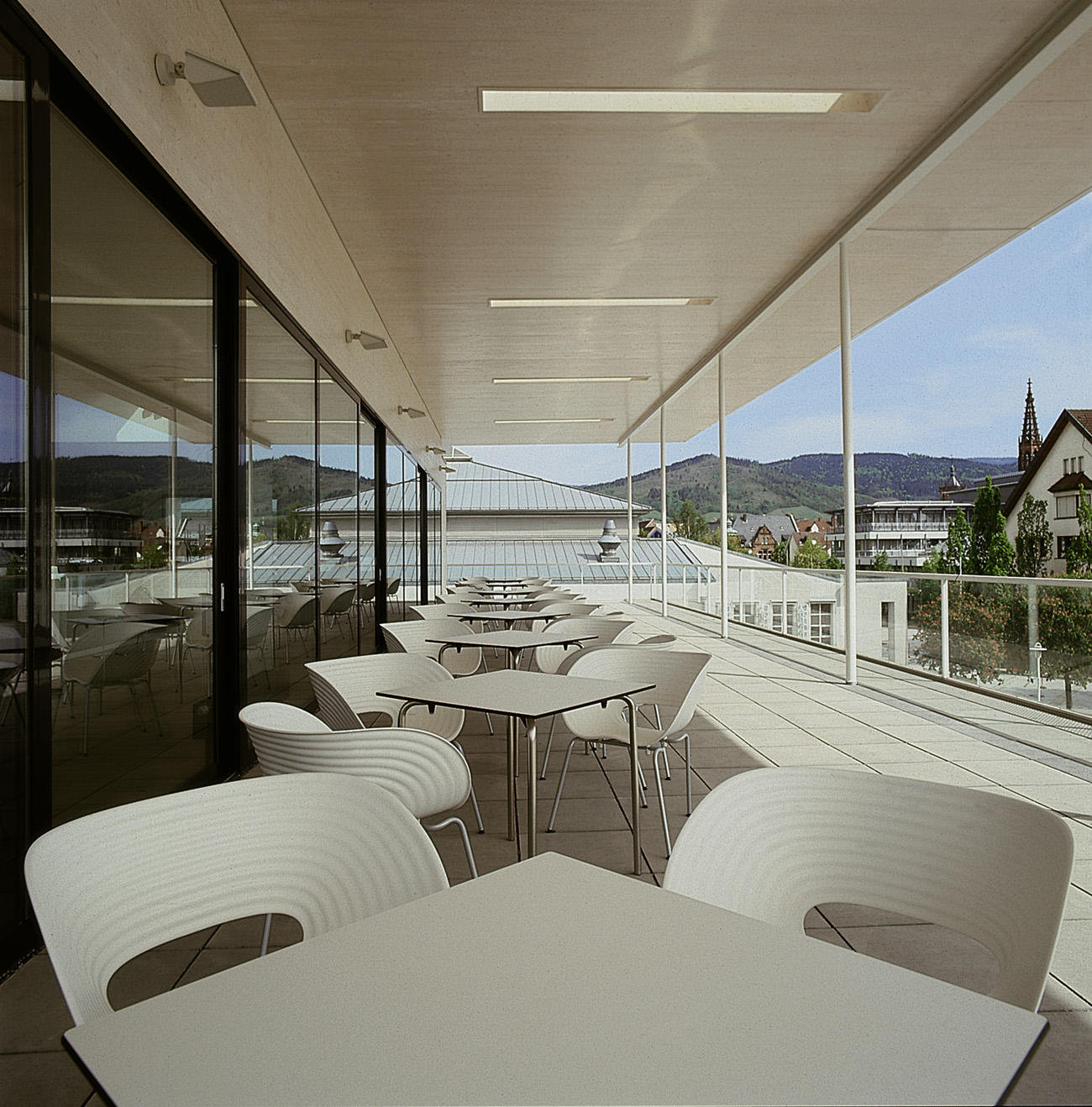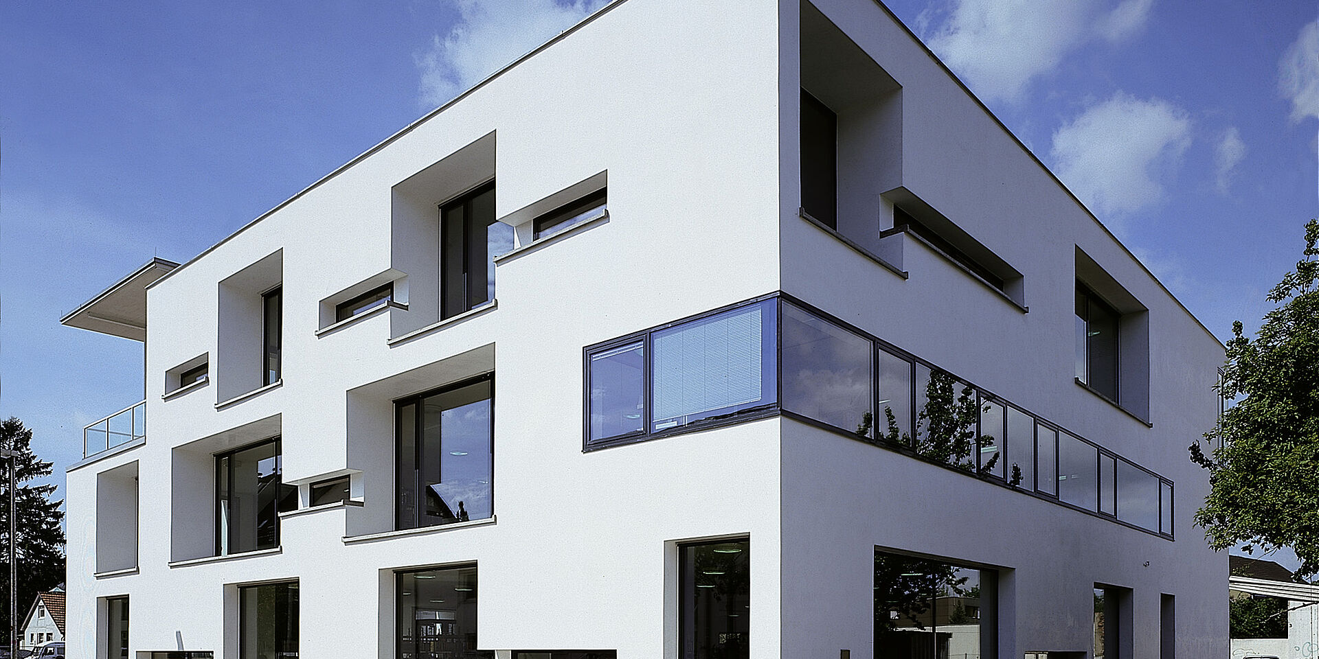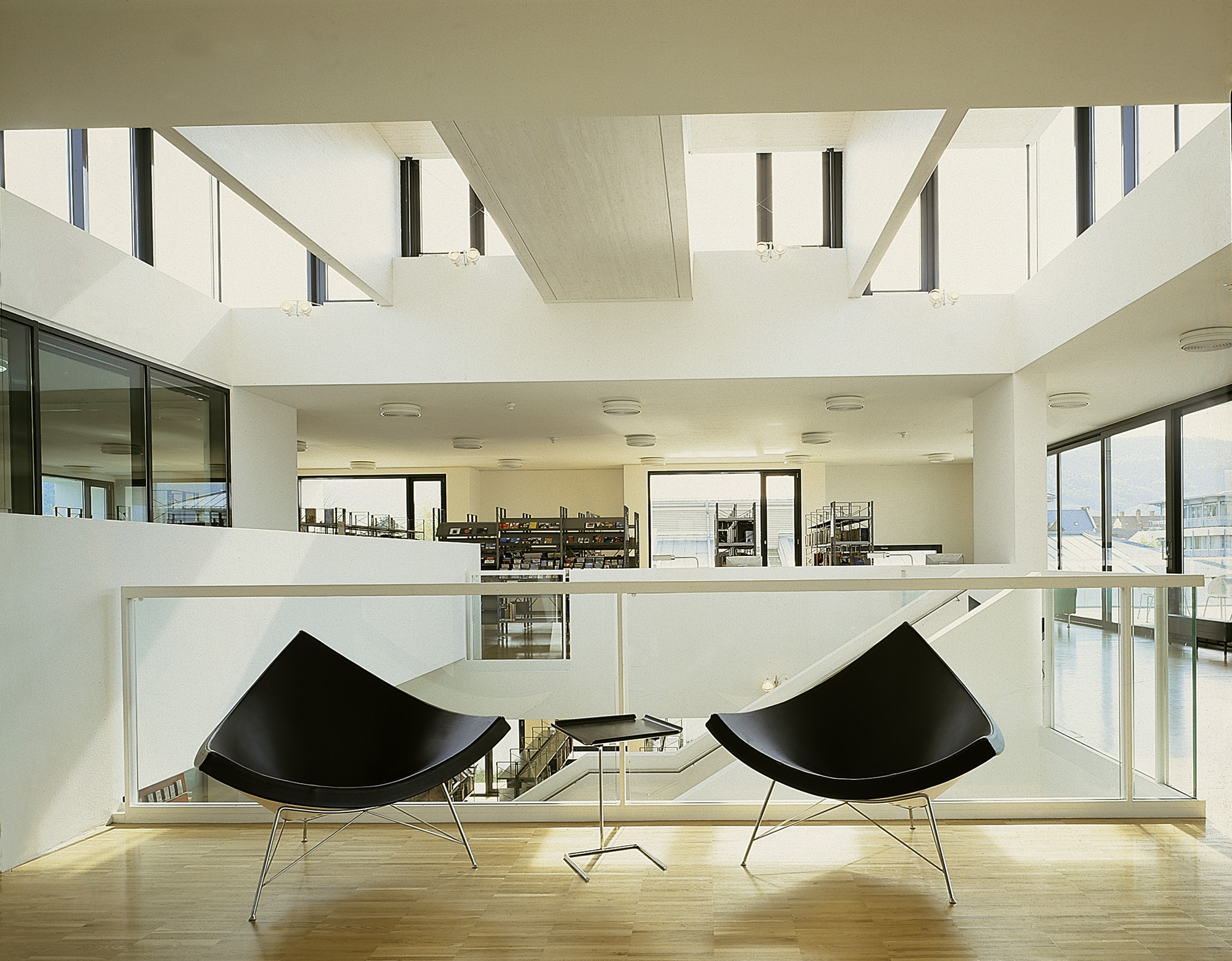 Das Objekt resultiert aus dem Gewinn eines Wettbewerbs 1998. Durch ein offenes Atrium mit Oberlicht sind die drei Ebenen der Mediathek über die Haupttreppe verbunden. Der Raum fließt auf nahezu quadratischem Grundriss die verschiedenen Bereiche des Hauses verbindend. Nach aussen ist die Fassade durch im Wechsel plastisch ausgeformte und flächenbündig gesetzten Fensteröffnungen gegliedert.