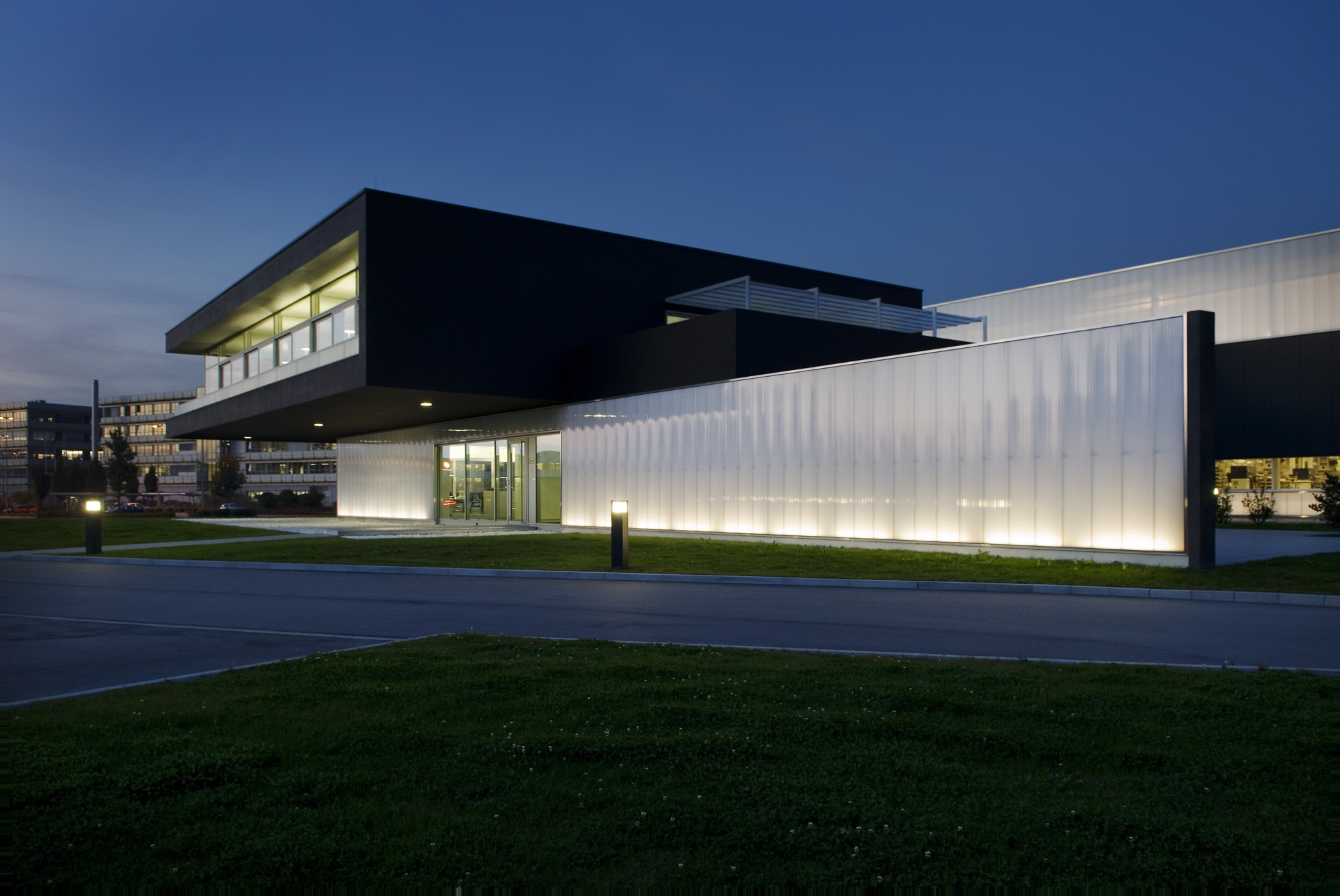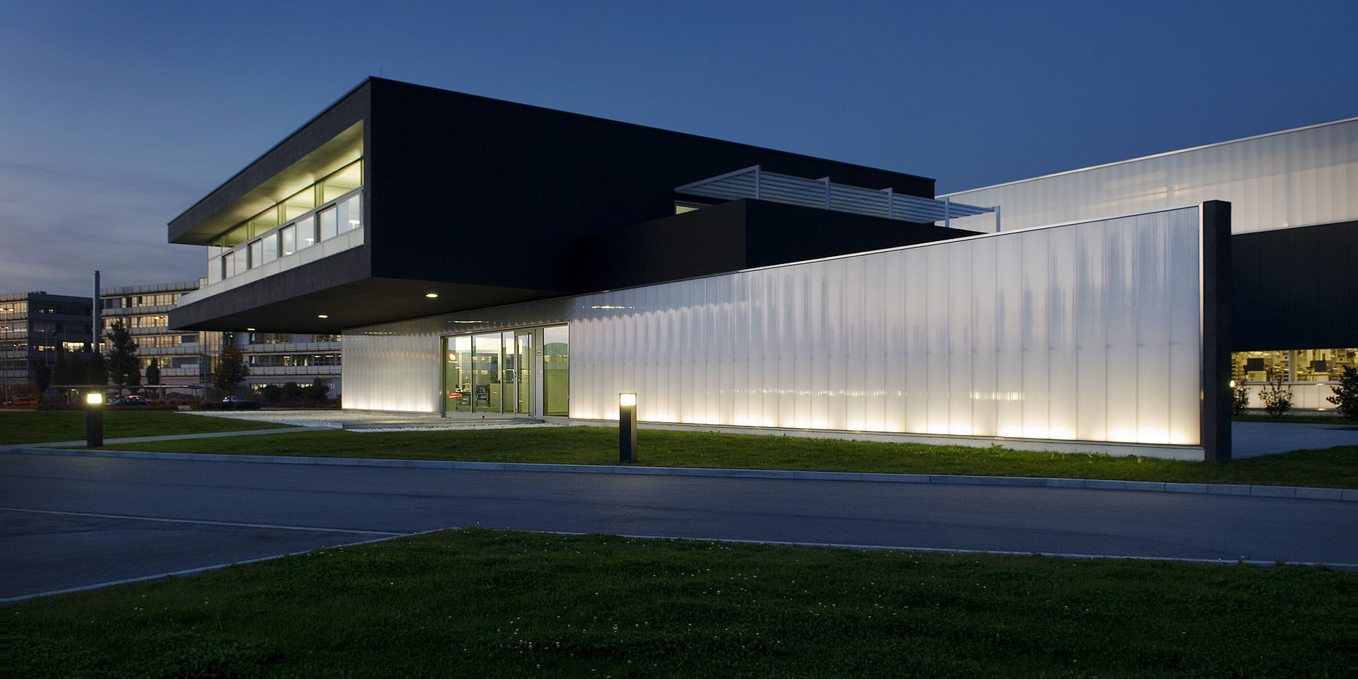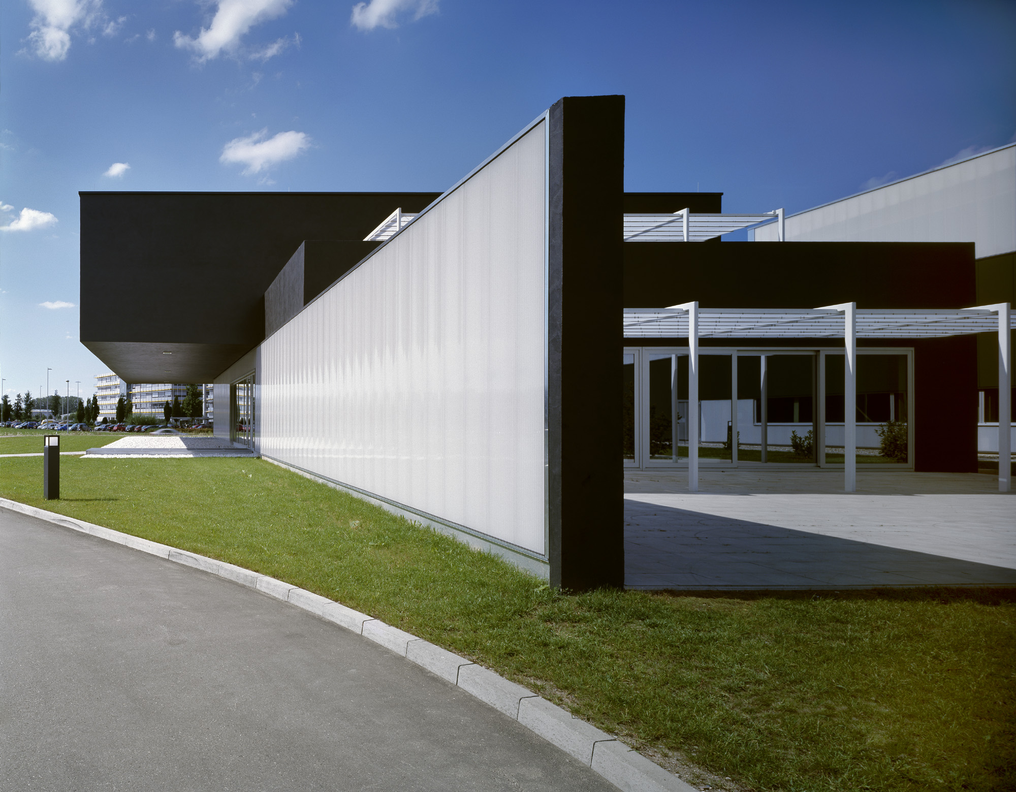 Neubau eines Produktionsgebäudes und eines Verwaltungsgebäudes. Die Gebäudestruktur folgt dem stringenten Materialfluß der thermoplastischen Verarbeitungslinien. Der Bürotrakt ist 7m frei diagonal auskragend. Integraler Bestandteil des Energiekonzeptes ist eine Raumtemperierung mittels Brunnenwasser.