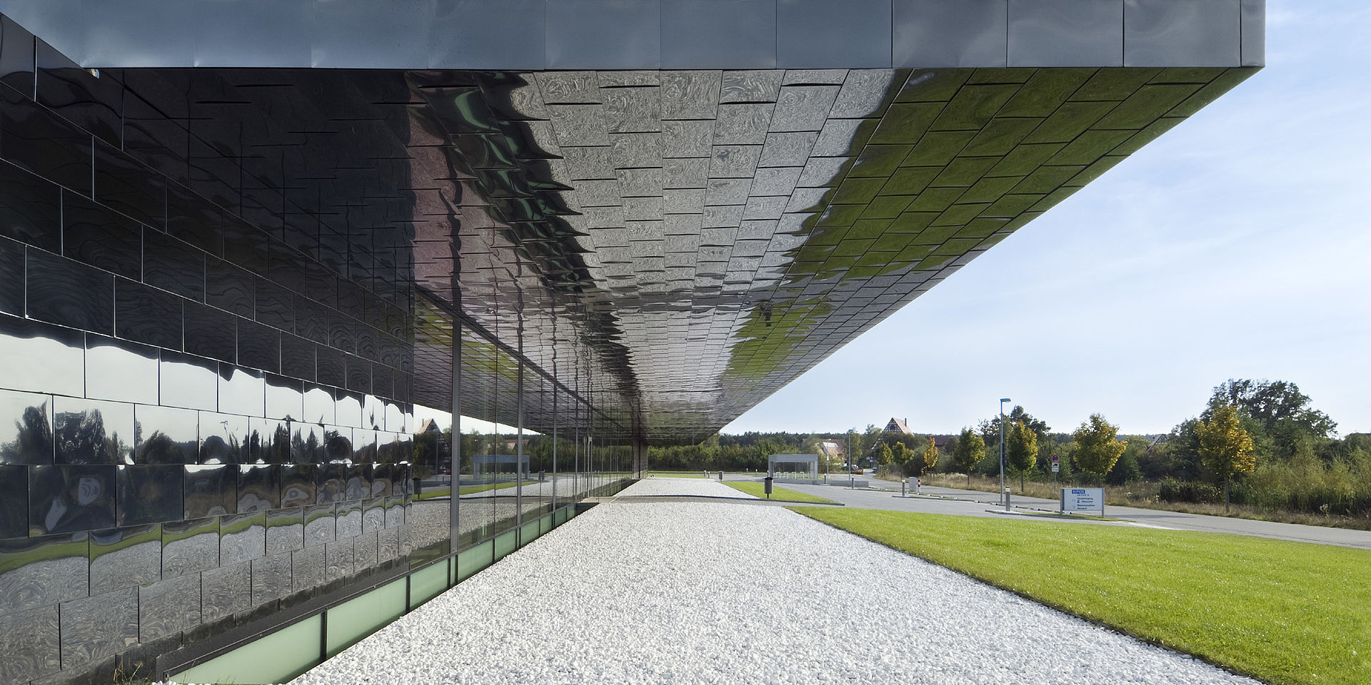 Als Fassadenmaterial wurden Edelstahlschindeln gewählt, welche die Geschlossenheit der Form des Baukörpers unterstützen, indem sie um die Ecke geführt werden können und mit denen auch die Untersichten der überstehenden Bauteile zu belegen sind. Der schwarz reflektierende Glanz entsteht durch eine transparente Chromoxidschicht, die an der Oberfläche aufgebaut wird.