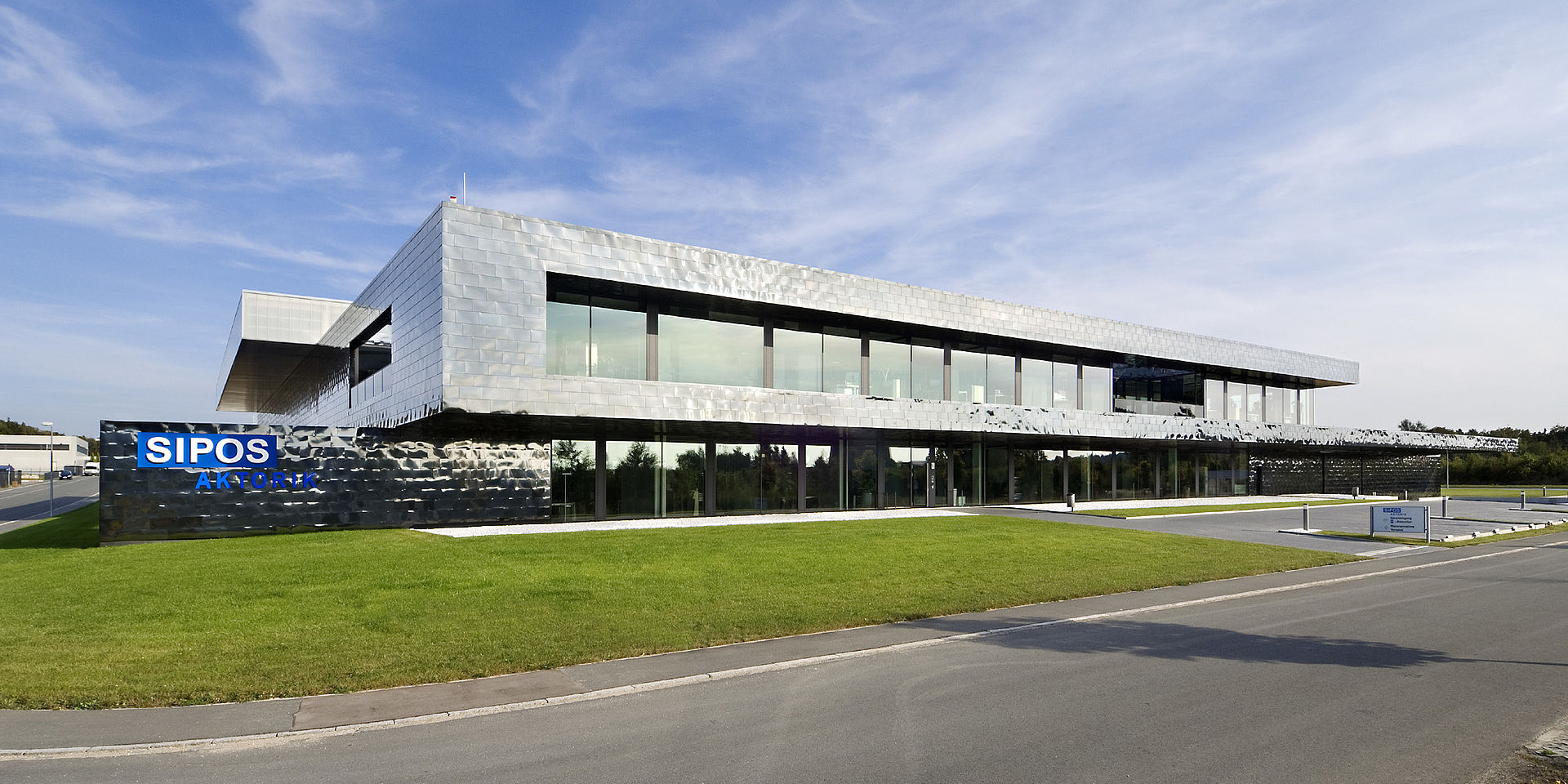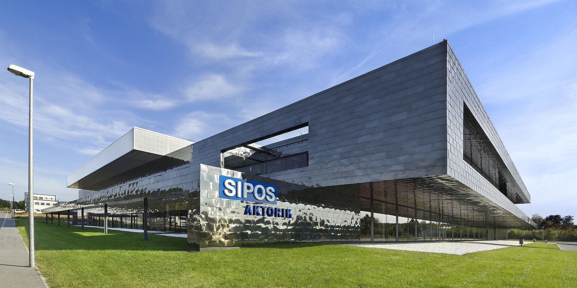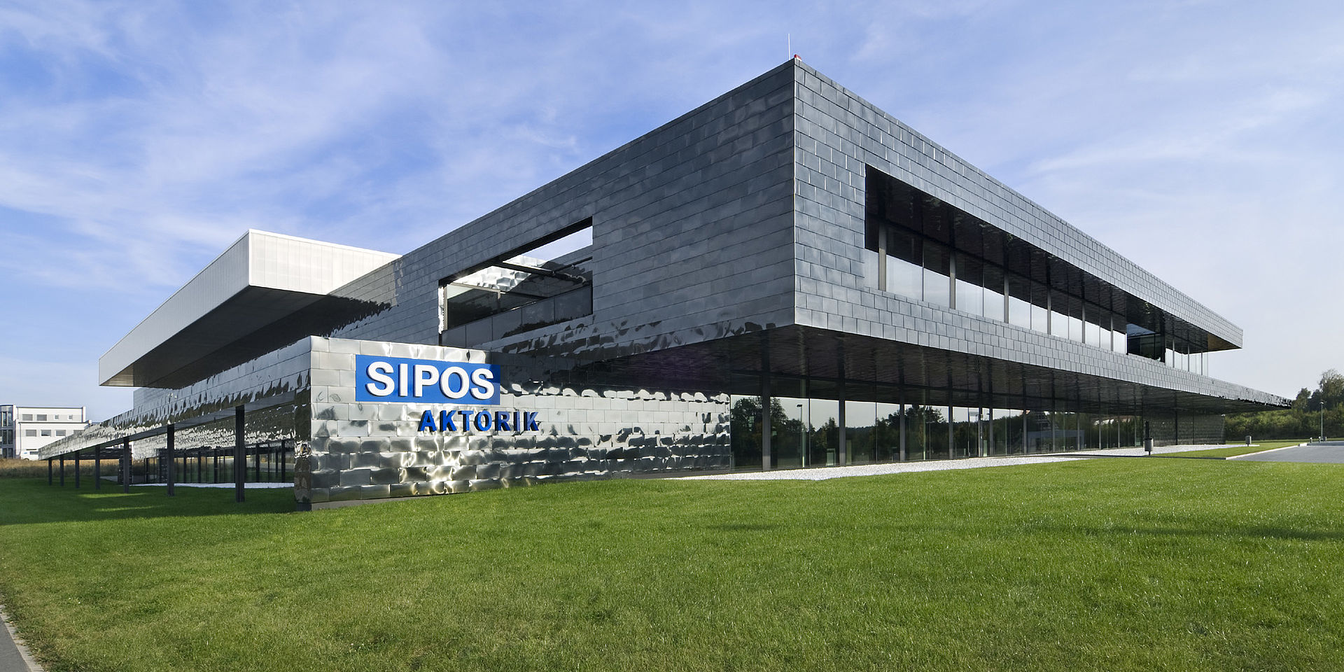 Der Neubau der Sipos Aktorik GmbH ist konzipiert als ein kompaktes Volumen, eingebettet in die leicht hügelige Landschaft bei Altdorf, das in seiner Raumwirkung mehr einer großen Villa als ähnelt als einem Produktionsgebäude.