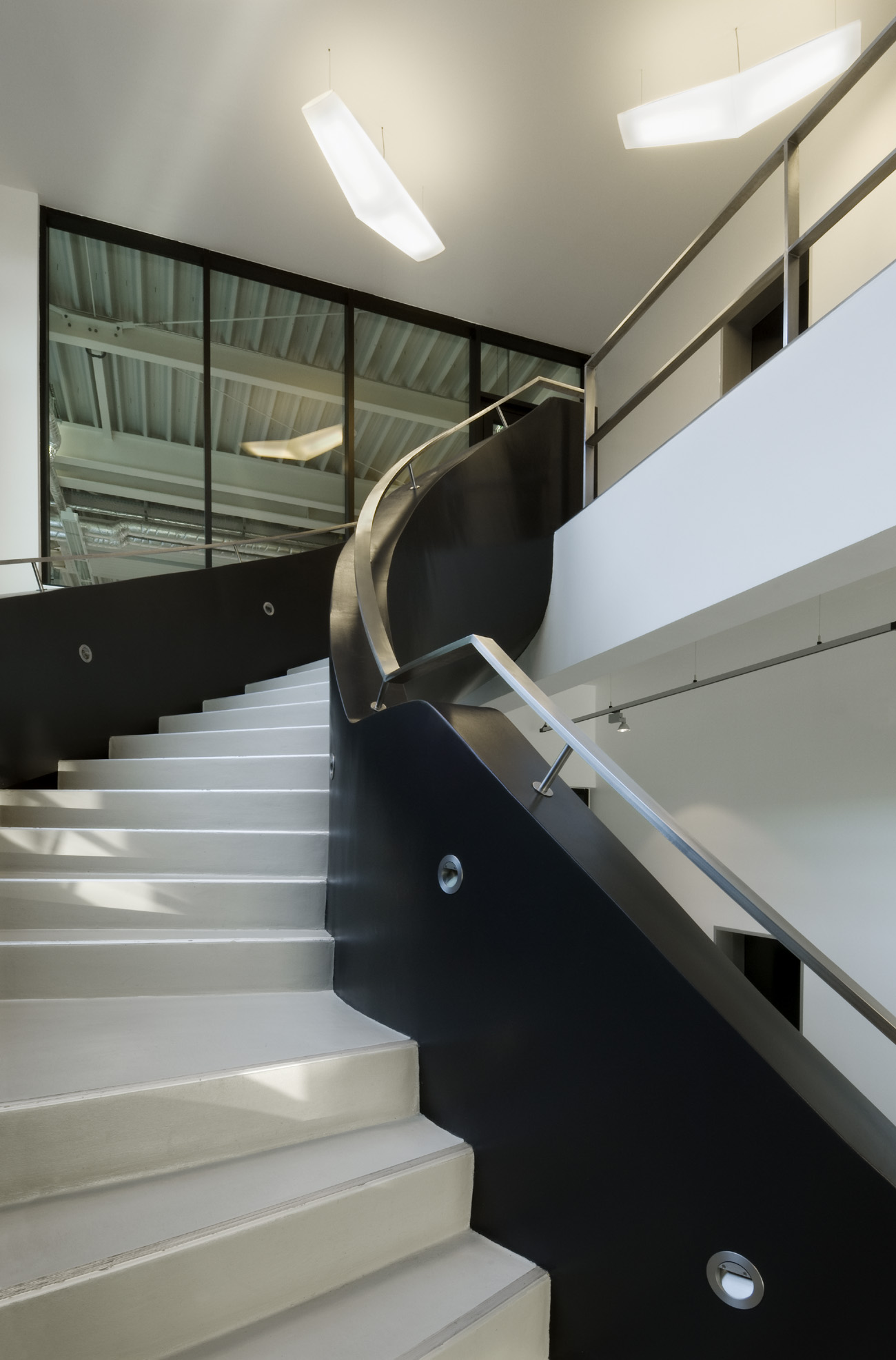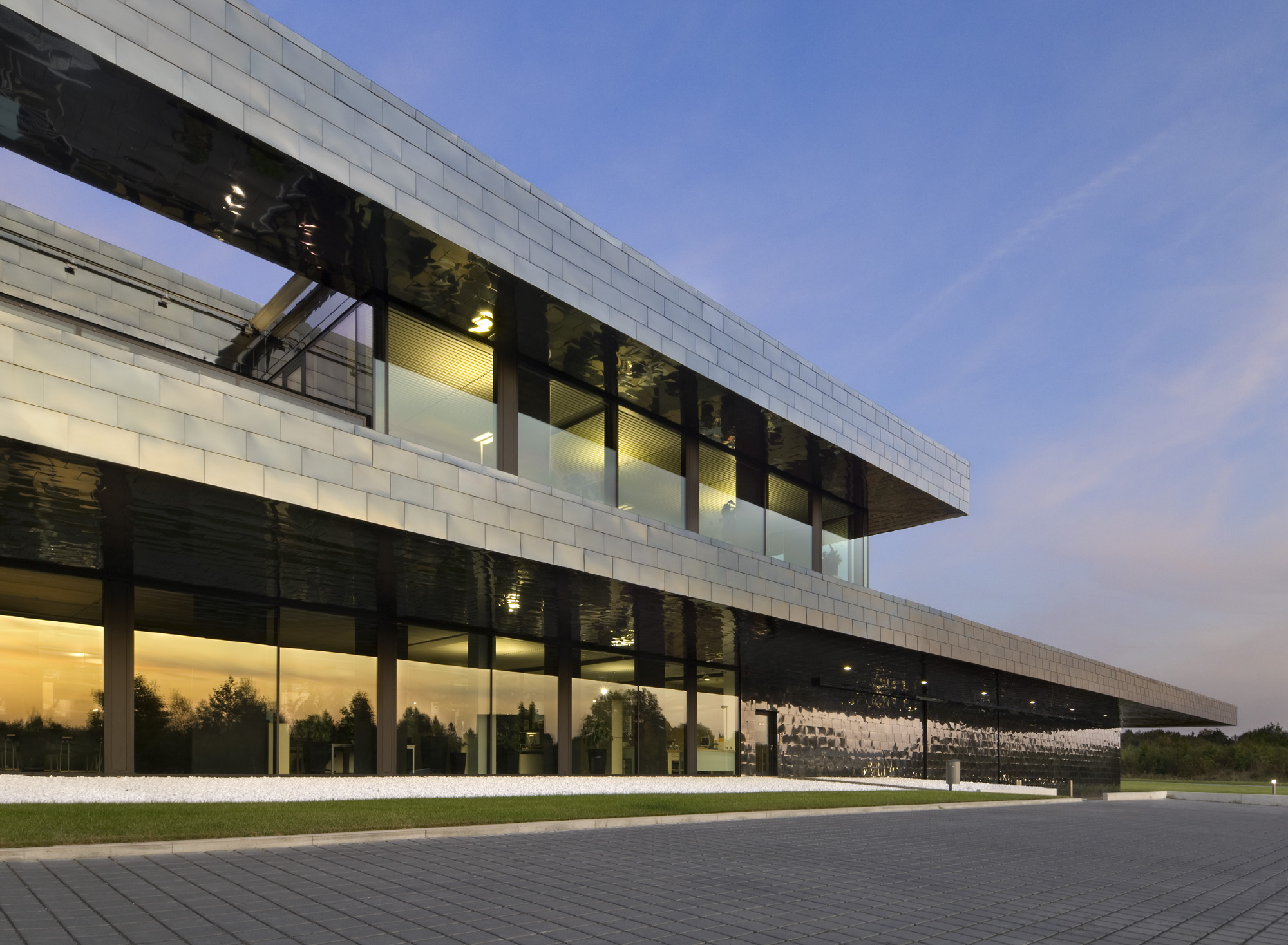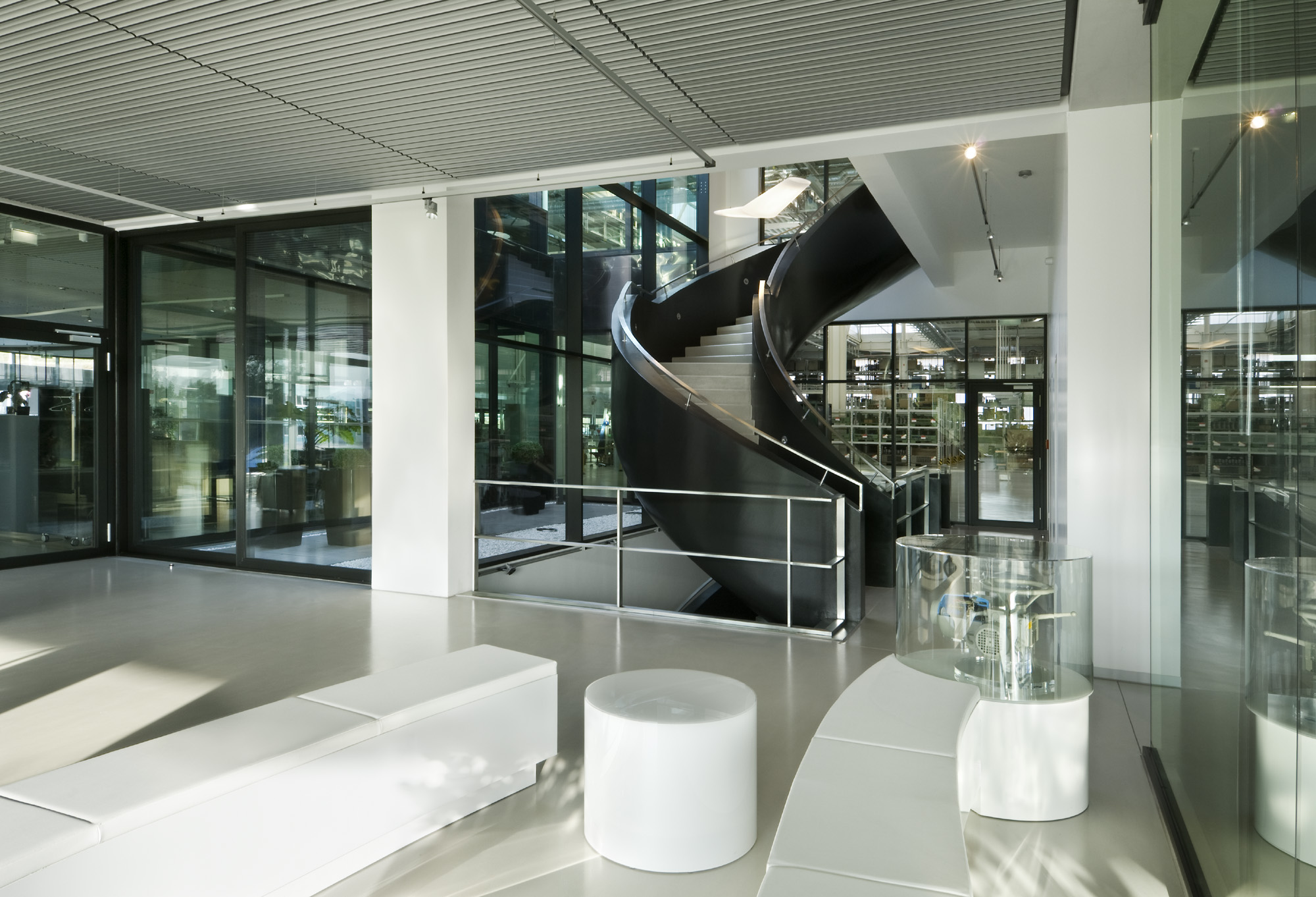 Die funktionale Trennung zwischen Montagehalle und dem zweigeschossigen Bürobereich wird aufgehoben durch raumhohe Glaswände, welche die Kommunikation zwischen diesen unterschiedlichen Arbeitswelten fördern.