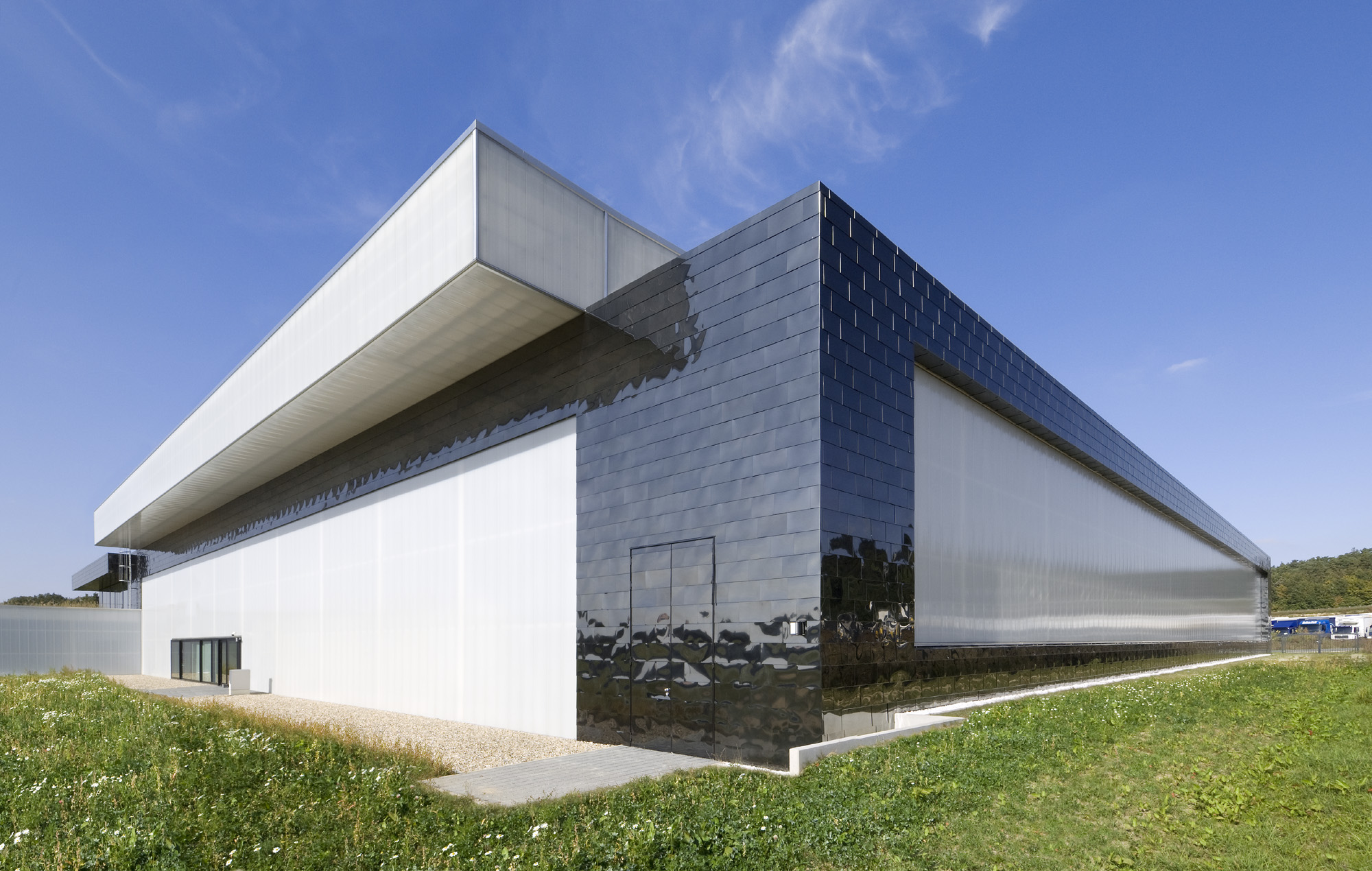 Der Baukörper ist in drei Teile gegliedert: die Montagehalle mit angegliedertem automatisierten Lager, dieser vorgelagert der zweigeschossige Verwaltungstrakt und anschließend an beide Bereiche eine Kaltlagerhalle mit Warenein- und Warenausgang. Die Nähe der einzelnen Betriebsbereiche soll ein Höchstmaß an interner Kommunikation ermöglichen.