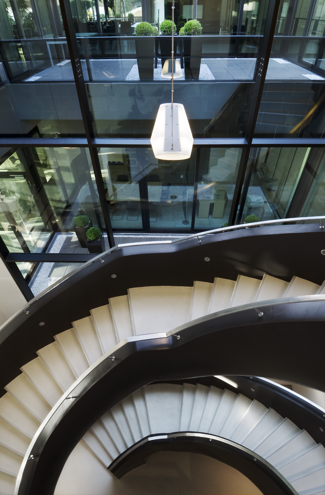 In den Verwaltungsbereich sind Lichthöfe, teils über zwei Geschosse eingeschnitten, diese sind durch große Glasschiebetüren vom Büroraum aus begehbar, Aussen und Innen werden miteinander verwoben. Eine Verschattung der Höfe ist mittels liegend angeordneter Vorhangrollos möglich. Um den Wärmeeintrag im Sommer bei hochstehender Sonne zu minimieren, werden die Fenster durch die überkragenden Bauteile natürlich verschattet. Im Winter hingegen, ist der energetische Wärmeeintrag der tiefstehenden Sonne, die dann direkt auf die Verglasung strahlt, eine willkommene Wärmequelle. Die Form der natürlichen Verschattung wurde mittels Sonnendiagramm ermittelt. Um Blendungen an den Arbeitsplätzen auszuschließen, ist das Gebäude mit innenliegenden Flächenvorhängen ausgestattet. Ein innovatives Kühlsystem temperiert die Büroarbeitsplätze angenehm über Metalldecken.