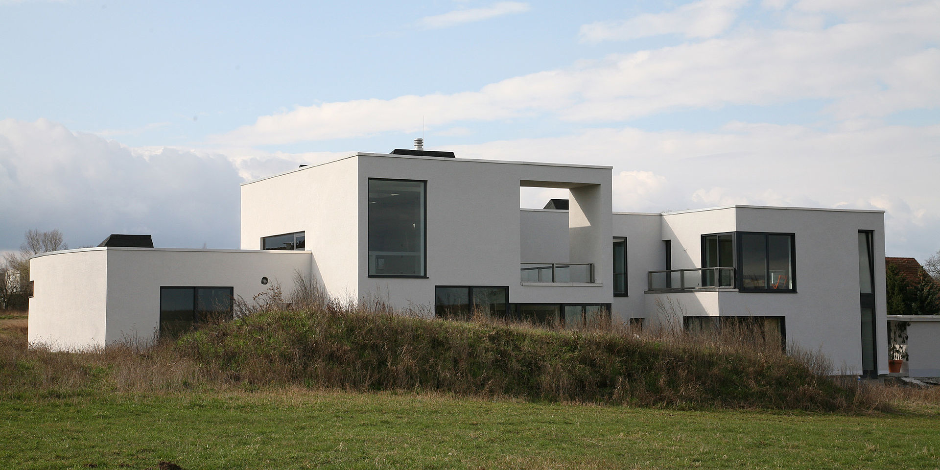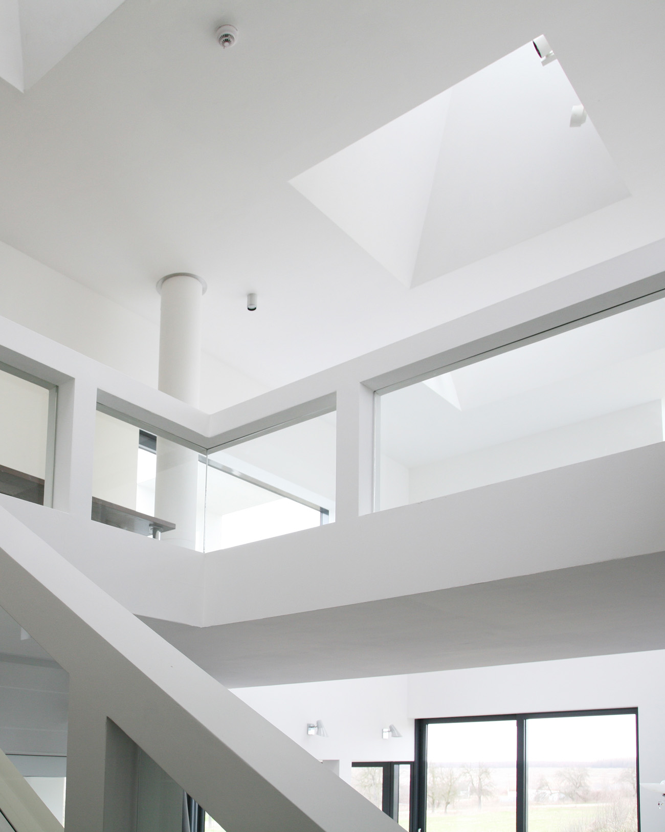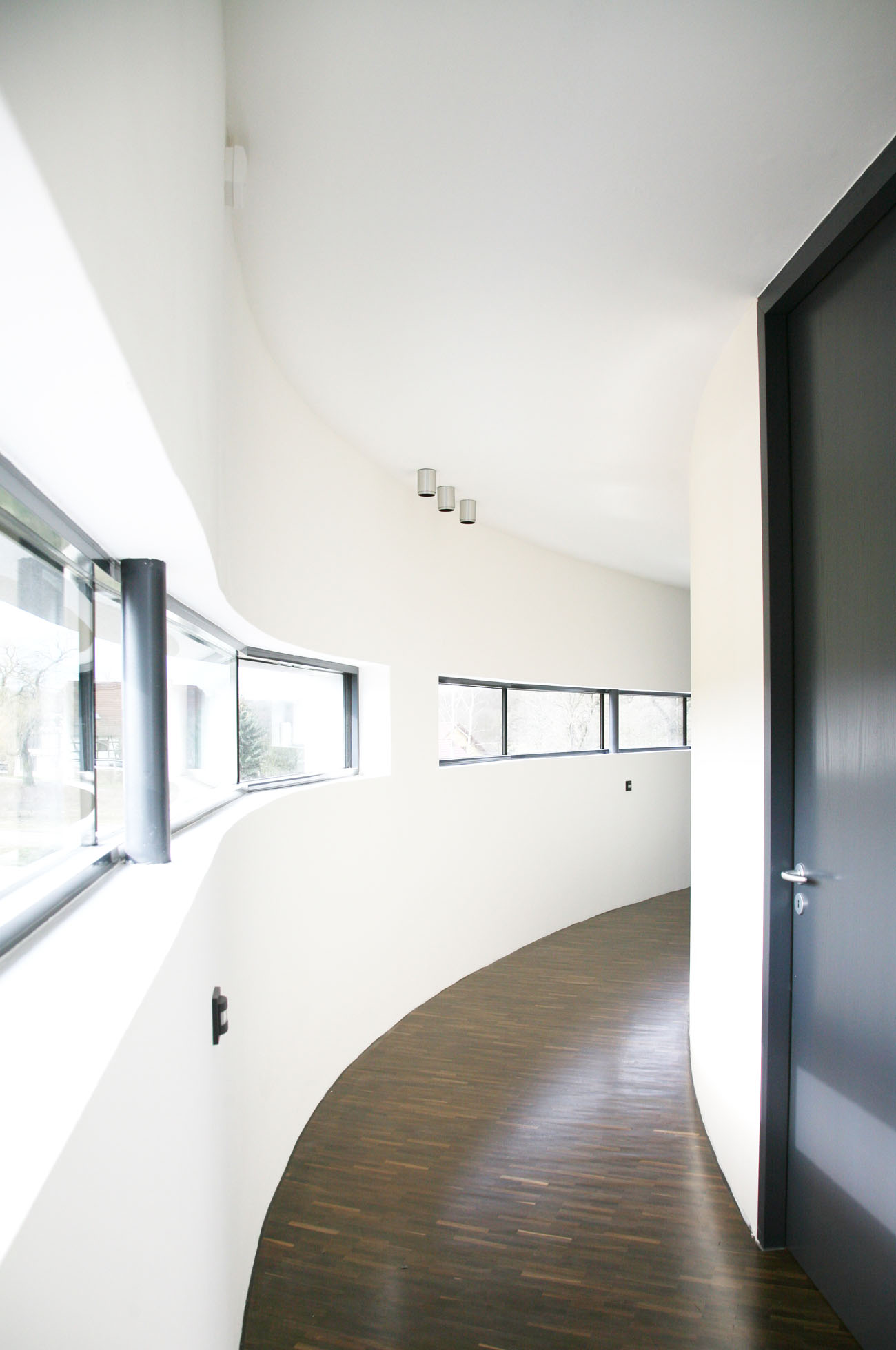Um den Wärmeeintrag im Sommer bei hochstehender Sonne zu minimieren, werden die Fenster durch die überkragenden Bauteile natürlich verschattet. Im Winter hingegen, ist der energetische Wärmeeintrag der tiefstehenden Sonne, die dann direkt auf die Verglasung strahlt, eine willkommene Wärmequelle. Die Form der natürlichen Verschattung wurde mittels Sonnendiagramm ermittelt. Um Blendungen an den Arbeitsplätzen auszuschließen, ist das Gebäude mit innenliegenden Flächenvorhängen ausgestattet. Ein innovatives Kühlsystem temperiert die Büroarbeitsplätze angenehm über Metalldecken.