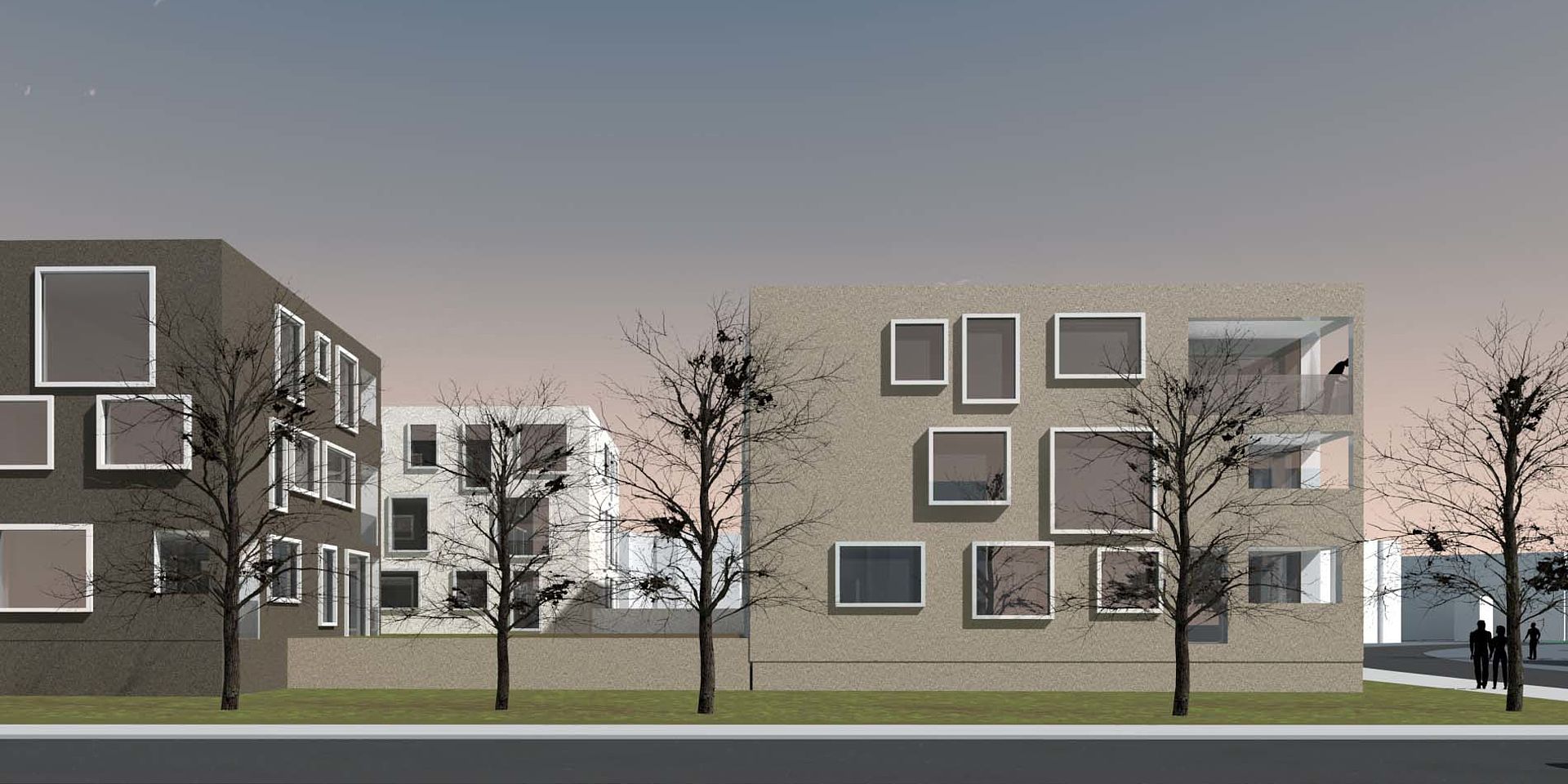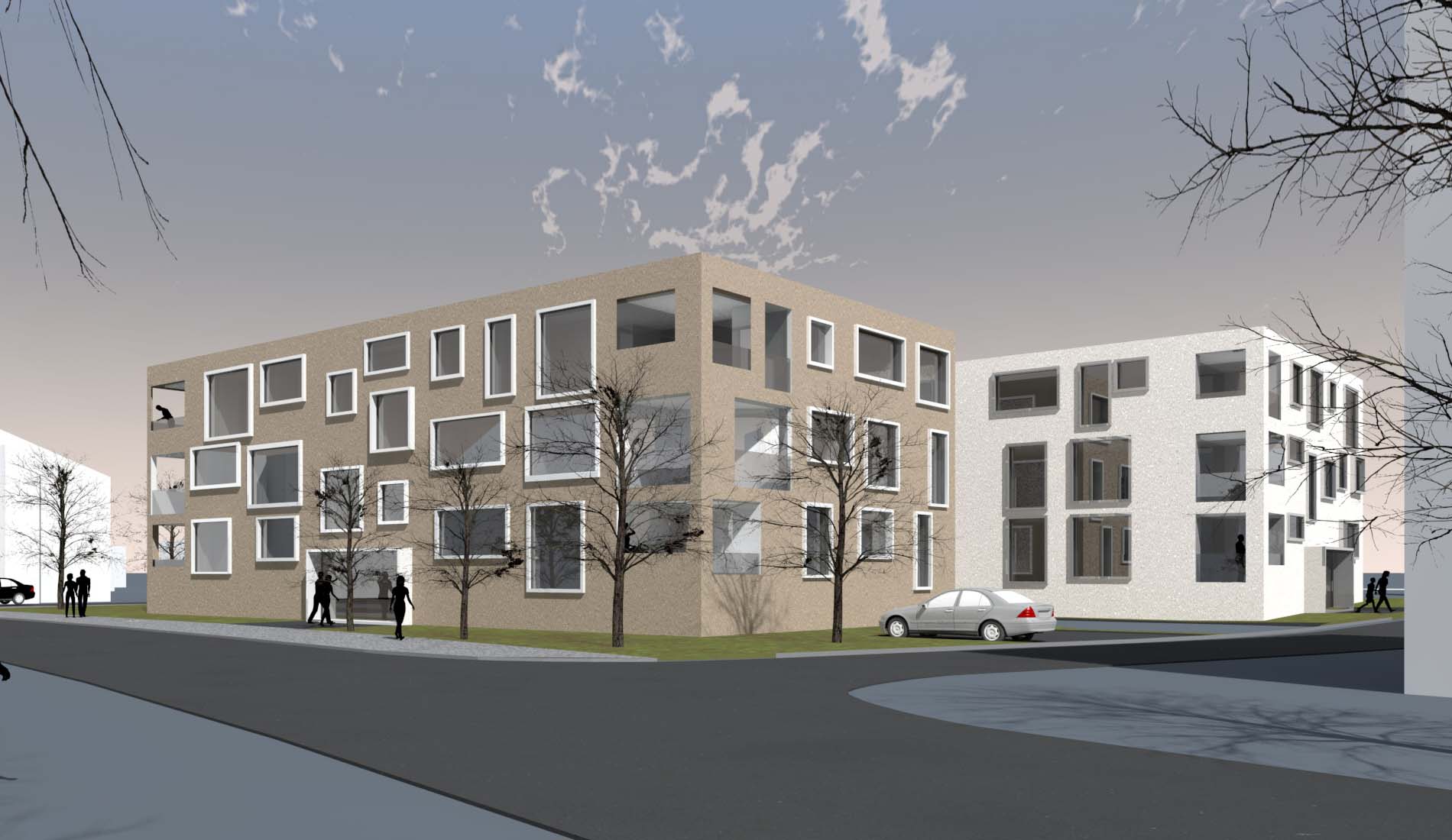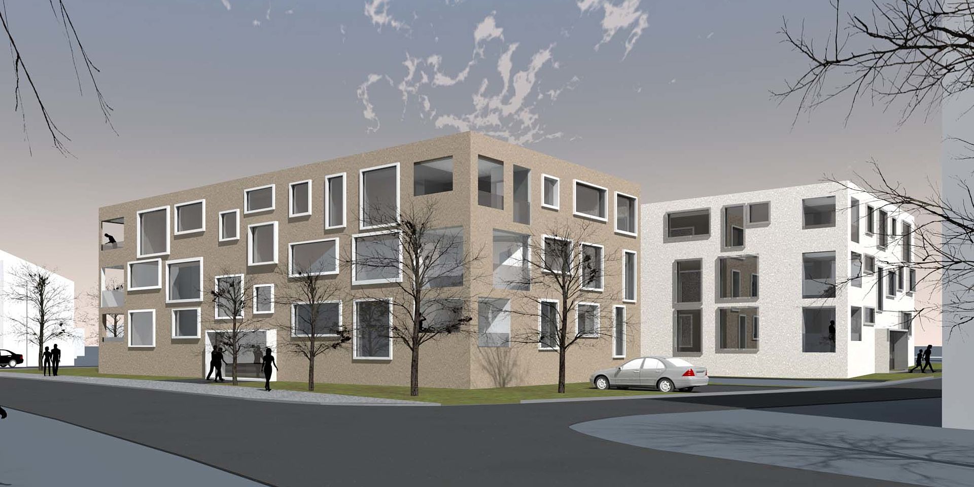 Drei Solitäre als Stadtvillen auf dem Grundstück verteilt. Die Gebäudehöhe ist einheitlich dreigeschossig mit einem leicht erhöhten Sockelgeschoss für die Tiefgarage. Der größte Baukörper nimmt städtebaulich Bezug auf die größeren Gebäude entlang der Martinstrasse, die rückwärtigen Solitäre beziehen sich auf die aufgelockerte kleinteiligere Bebauung.