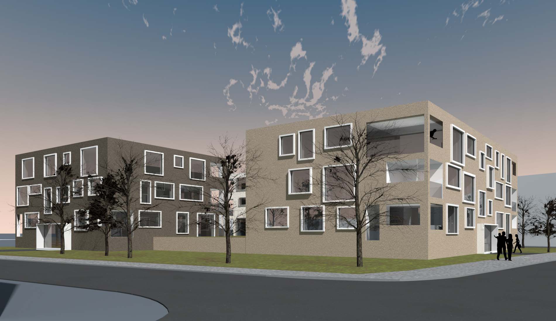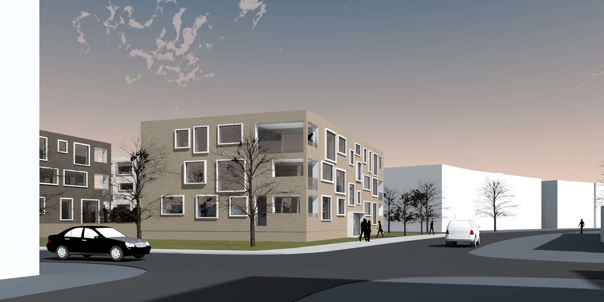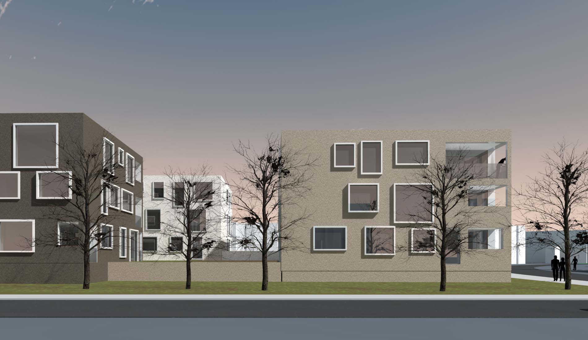 Drei Solitäre als Stadtvillen auf dem Grundstück verteilt. Die Gebäudehöhe ist einheitlich dreigeschossig mit einem leicht erhöhten Sockelgeschoss für die Tiefgarage. Der größte Baukörper nimmt städtebaulich Bezug auf die größeren Gebäude entlang der Martinstrasse, die rückwärtigen Solitäre beziehen sich auf die aufgelockerte kleinteiligere Bebauung.