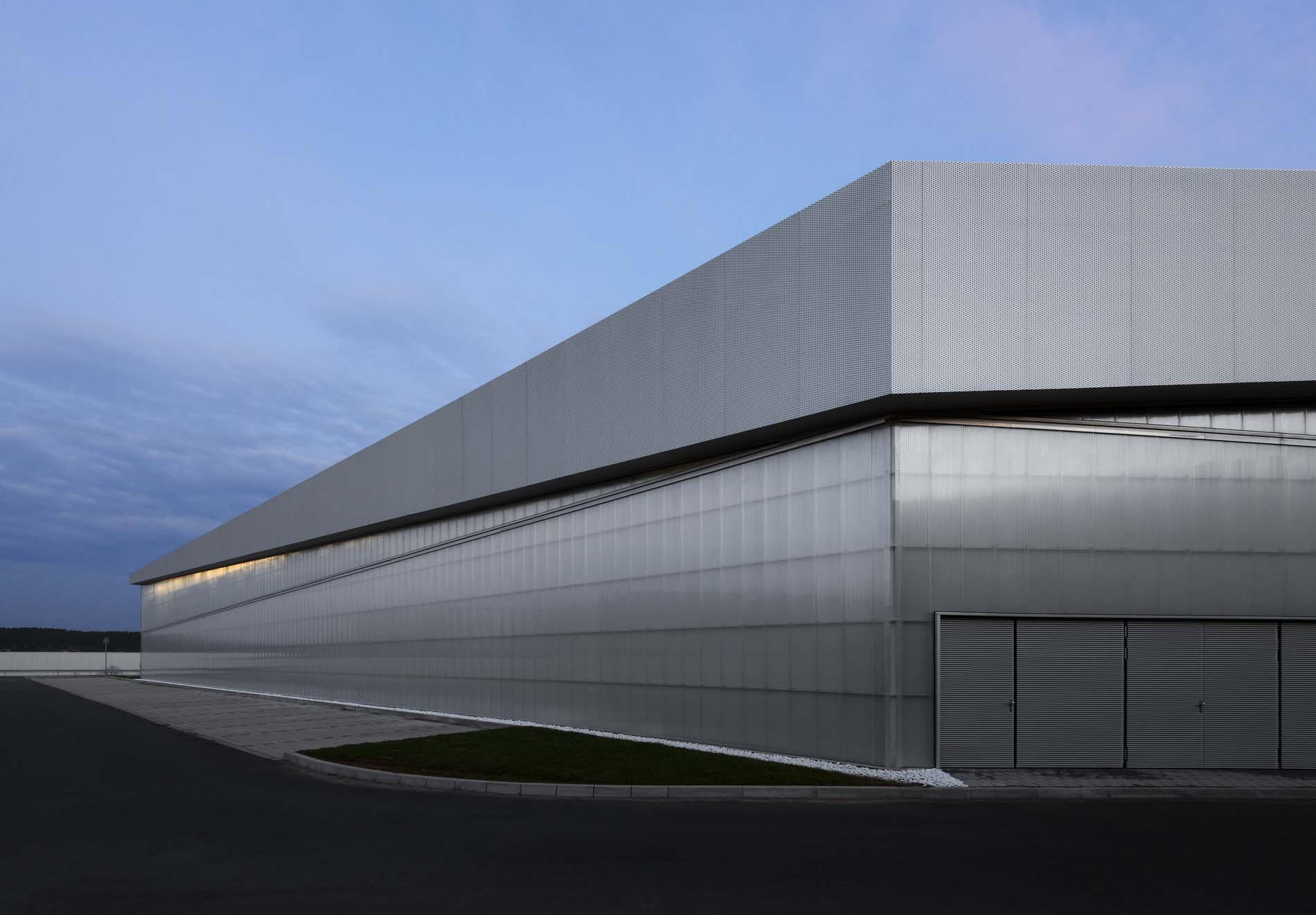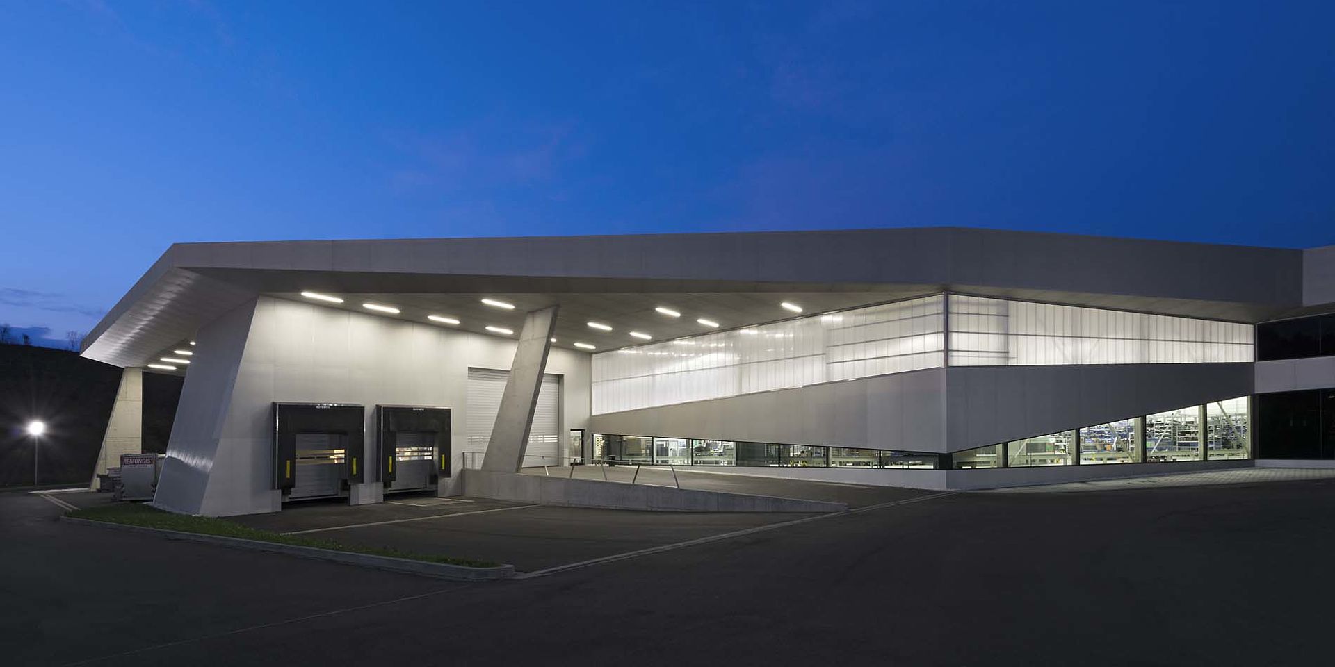 Die Grundanordnung besteht aus der Montagehalle mit den angegliederten Bereichen der Verladehalle und einem automatischen Regallager. Der Montagehalle vorgelagert bildet der zweigeschossige Baukörper der Verwaltung mit dieser die Eingangssituation. Das Untergeschoss beherbergt Sozialräume und die Kantine, die über einen Tiefhof natürlich belichtet wird und sich über die raumhohe Verglasung in diesen Freibereich erweitert.