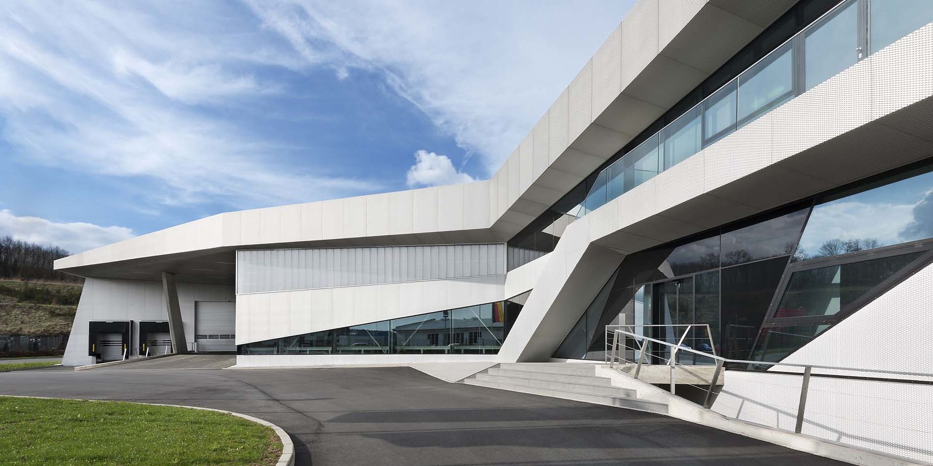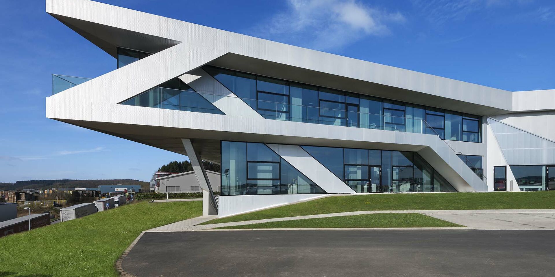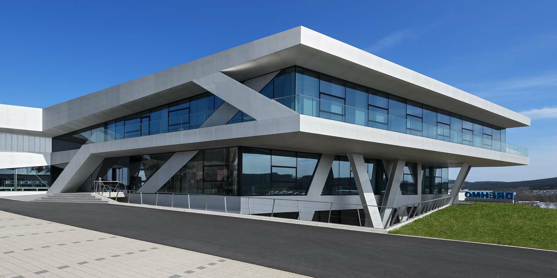 Der besondere Zuschnitt des Neubaus der Drehmo GmbH ist der topografischen Situation im Bergischen Land geschuldet. Die bewegte Landschaft bedingt die Terrassierung der Landschaft und erzeugt das unregelmäßig geformte Grundstück. Die so generierte ungewöhnliche Grundrissfigur und die Hanglage mit Blick über das Tal im Sauerland bestimmen den Charakter und die außergewöhnliche Linienführung.