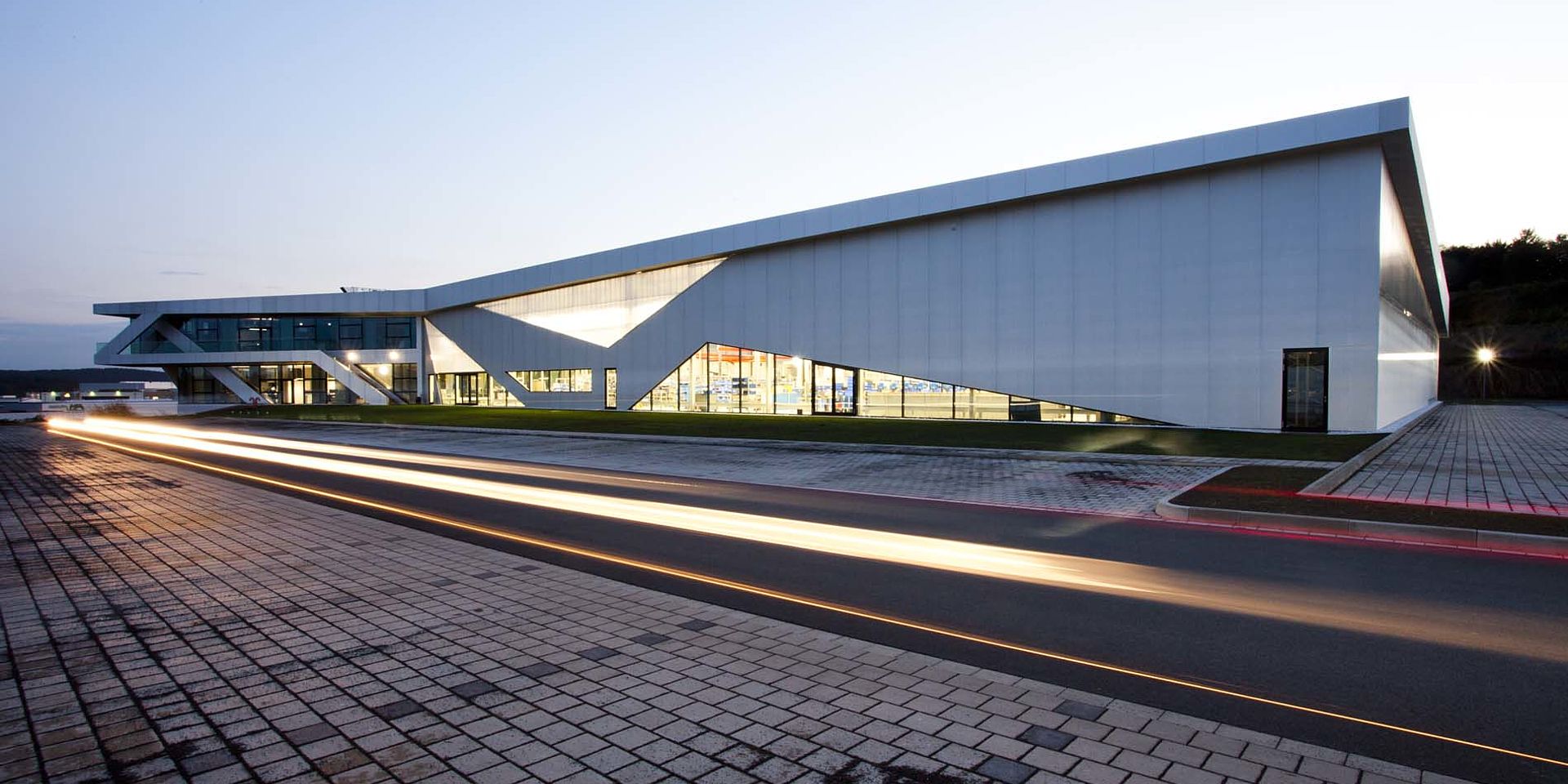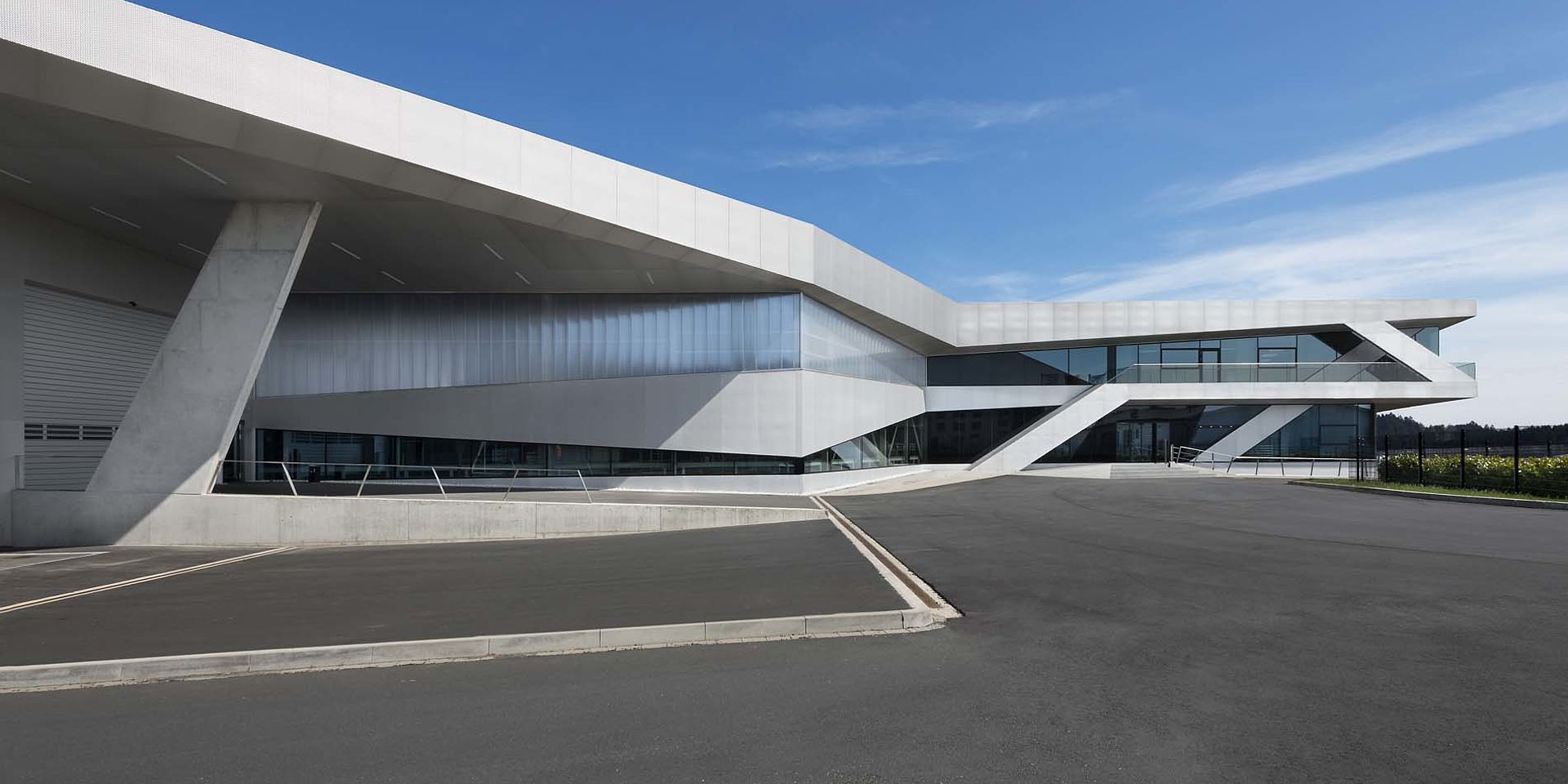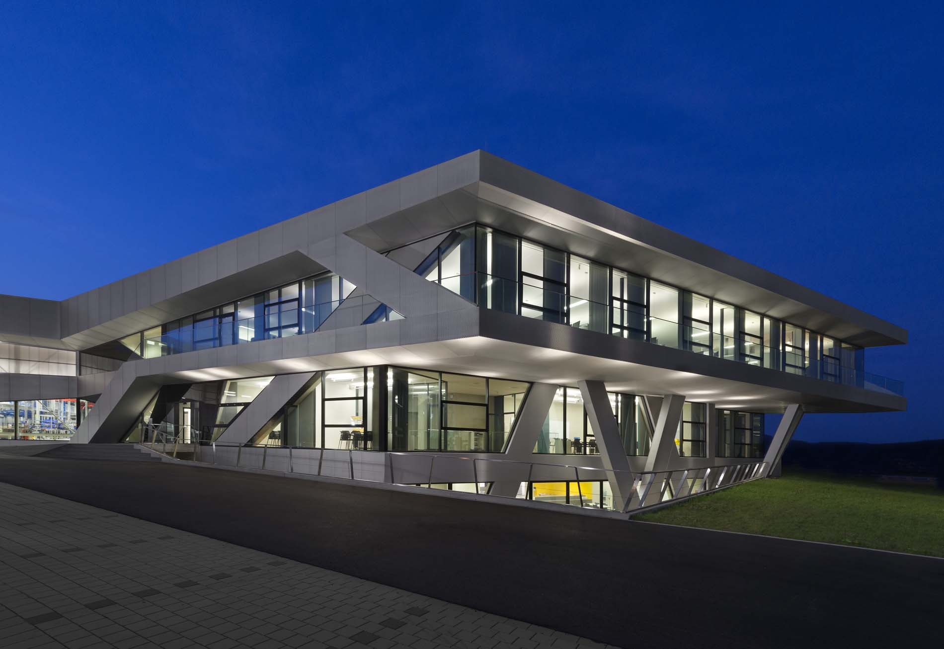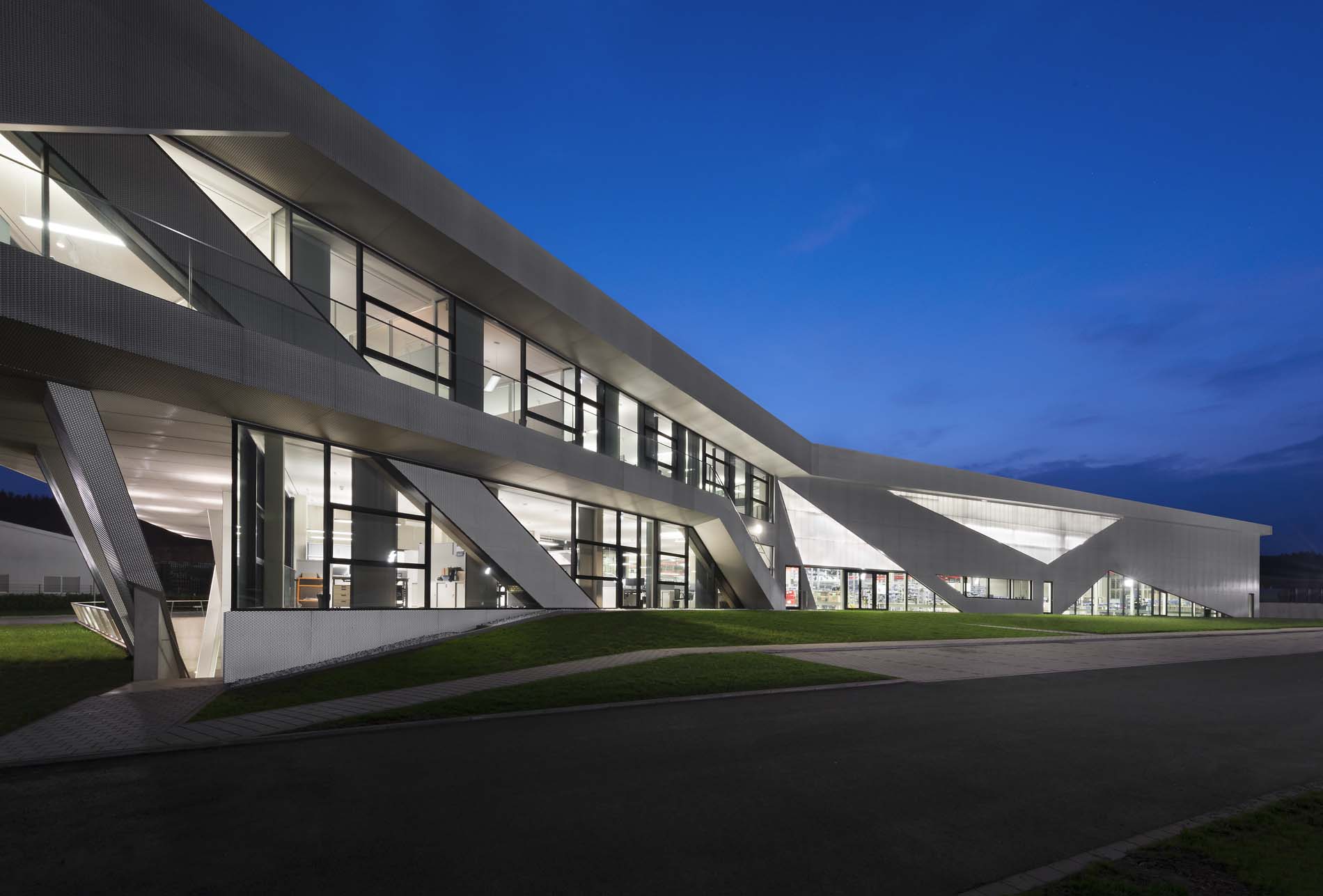 Der besondere Zuschnitt des Neubaus der Drehmo GmbH ist der topografischen Situation im Bergischen Land geschuldet. Die bewegte Landschaft bedingt die Terrassierung der Landschaft und erzeugt das unregelmäßig geformte Grundstück. Die so generierte ungewöhnliche Grundrissfigur und die Hanglage mit Blick über das Tal im Sauerland bestimmen den Charakter und die außergewöhnliche Linienführung.