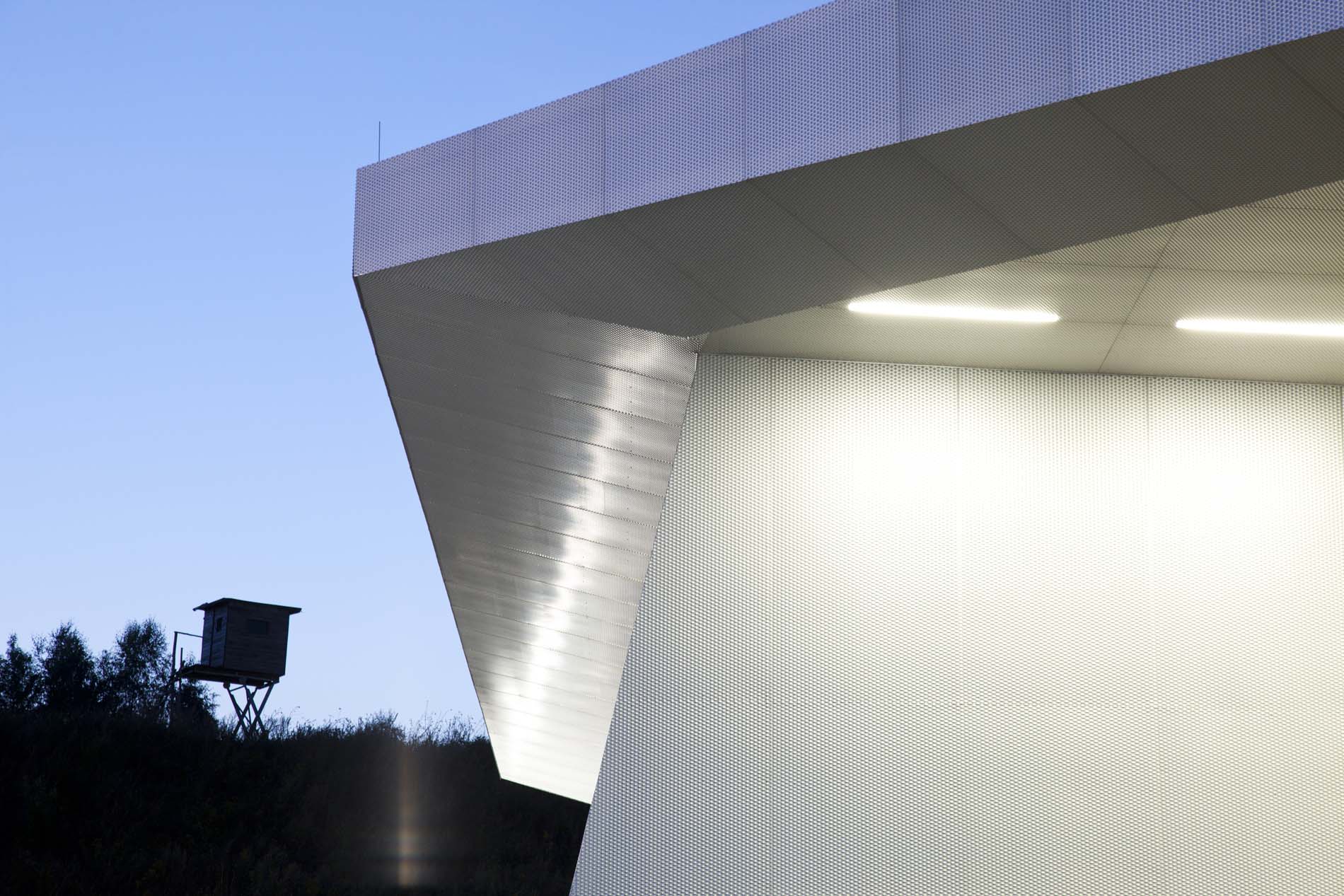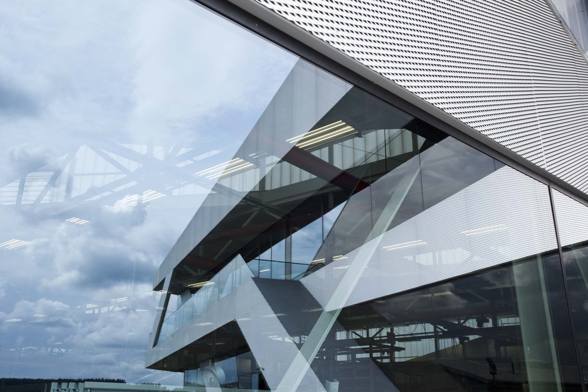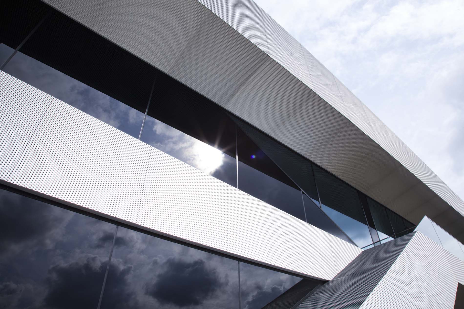 Den gesamten Gebäudekomplex überspannt das Dach mit einer überhohen Attika, die wie ein Band, in der Höhe mäandernd die Körper umschließt. Durch die homogene Materialität der Attika, der Dachuntersichten, Stützen und in Teilen der Wandverkleidung, mittels heller Streckmetall-Aluminium-Platten, wird das Körperhafte der Konstruktion betont. Konstruktiv wirksame Streben, die schräg zwischen den einzelnen Ebenen oder bis zum Baugrund spannen; bilden eine Art zeitgemäßes Fachwerk, stützend und formgebend zugleich. Ein helles Streckmetall, auch in Details präzise verarbeitet, bildet die Konturen und Grate scharf nach.