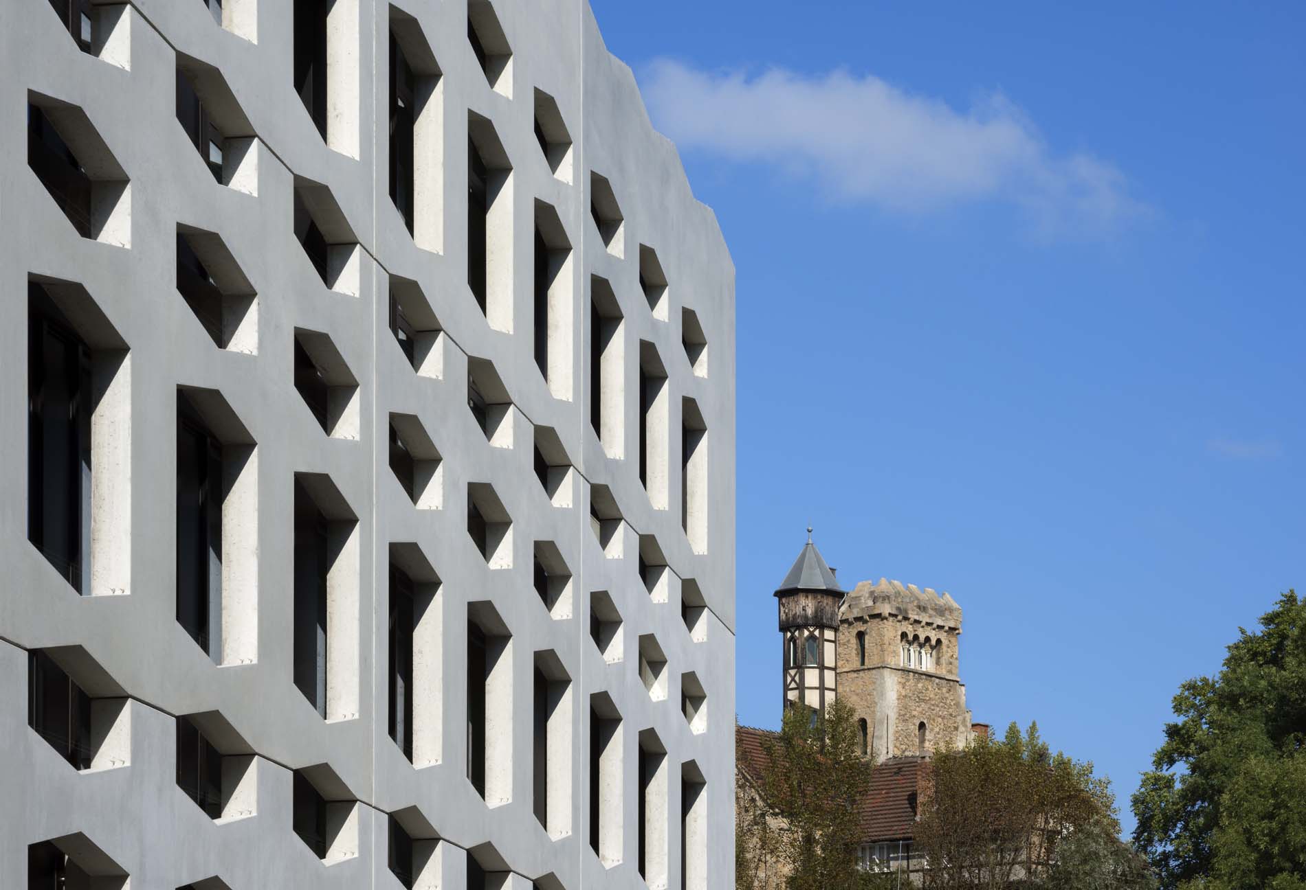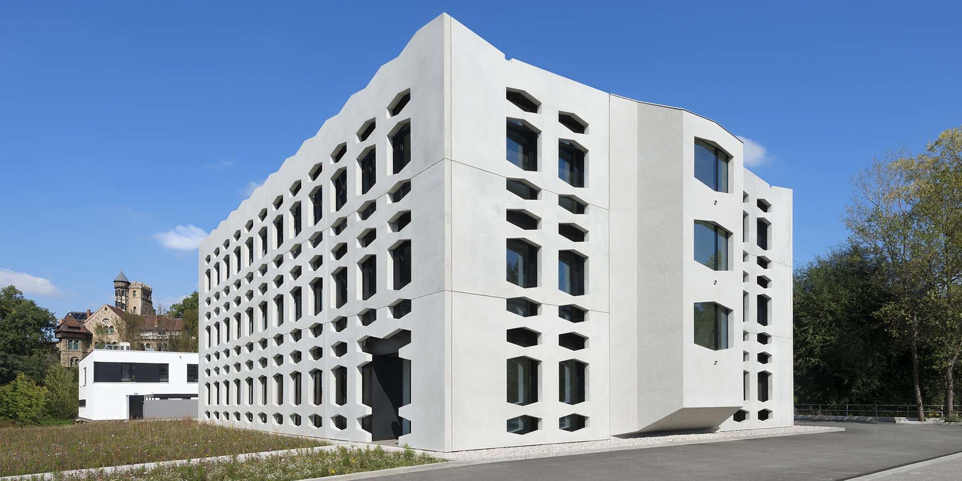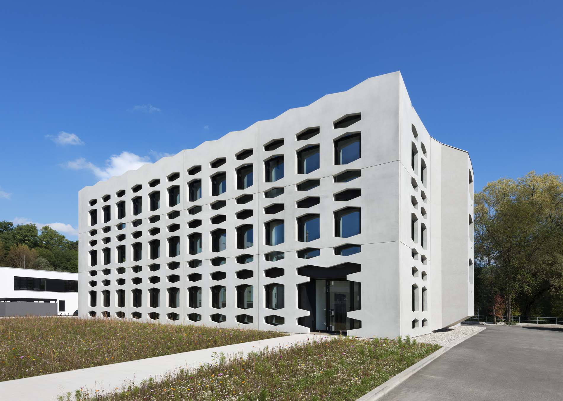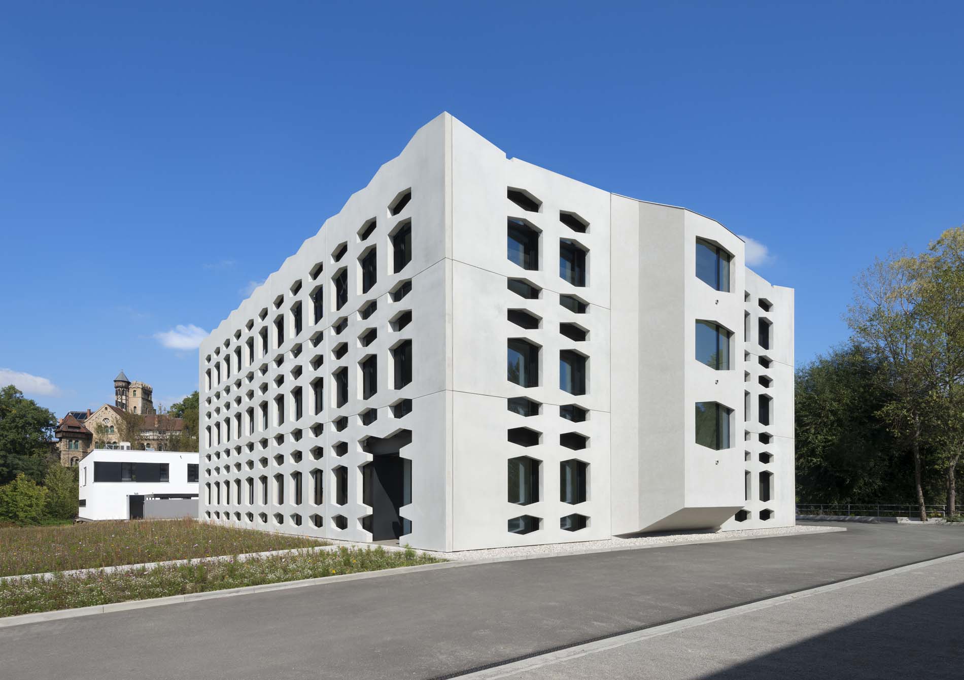 Nach Rückbau der Bestandsfassade und Erstellung des inneren Tragwerkes wurde das Gebäude mit einer ersten Fassadenschicht aus raumhohen Fensterelementen und Aluminiumpaneelen geschlossen. Dieser raumabschließenden Ebene wurde eine weitere Hülle aus Betonfertigteilen vorgestellt. Diese zieht sich als perforierte Wand, wie ein vorgestellter Schirm, um das Gebäude. Der Solidität des Materials Beton zum Trotz wirkt das Gebäude weiterhin leicht. Das strenge Muster der Fensteröffnungen, die Wand durchbrechend, und die weit zurückliegenden Fenster lassen an einen Scherenschnitt denken. Der traufseitig gezahnte und giebelseitig überhöht vom Bestand übernommene Dachabschluss geben dem Gebäude trotz aller Strenge etwas verspieltes.