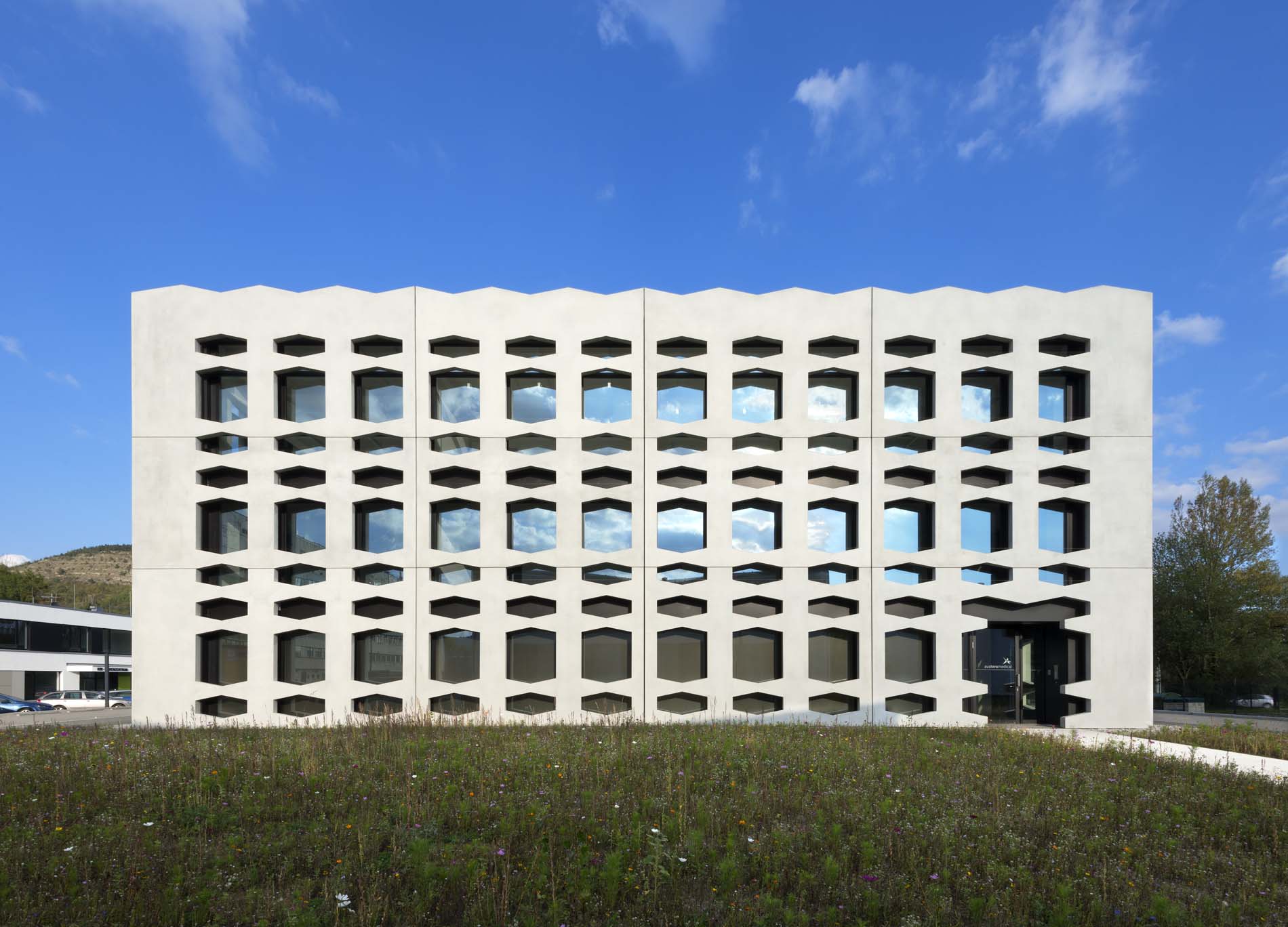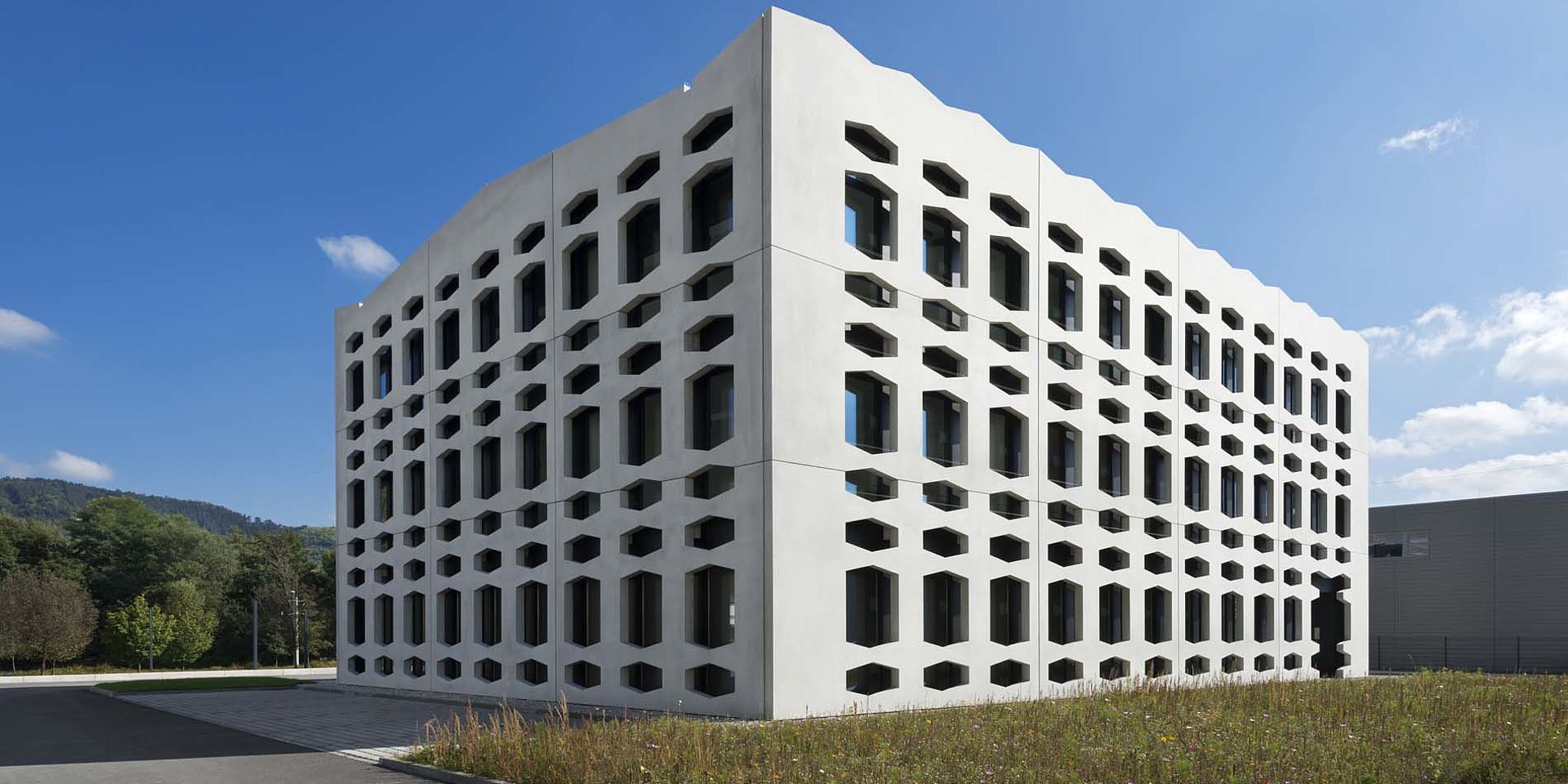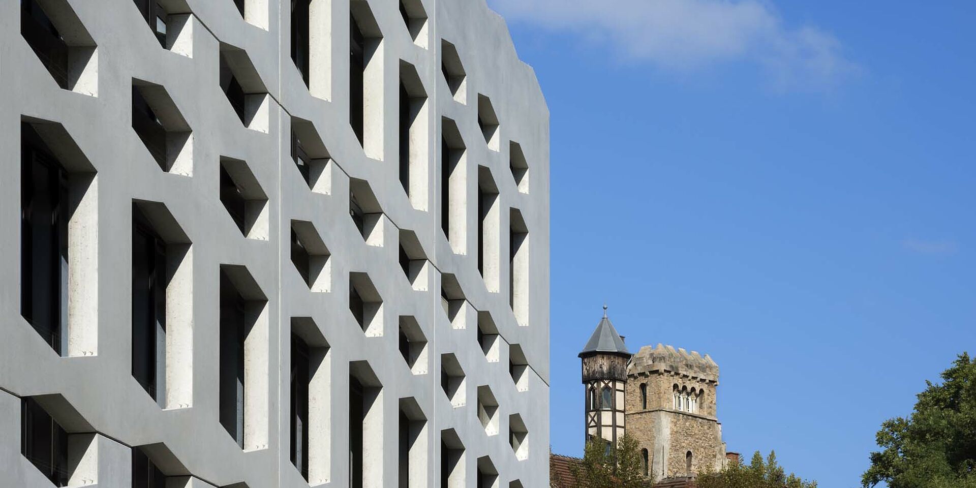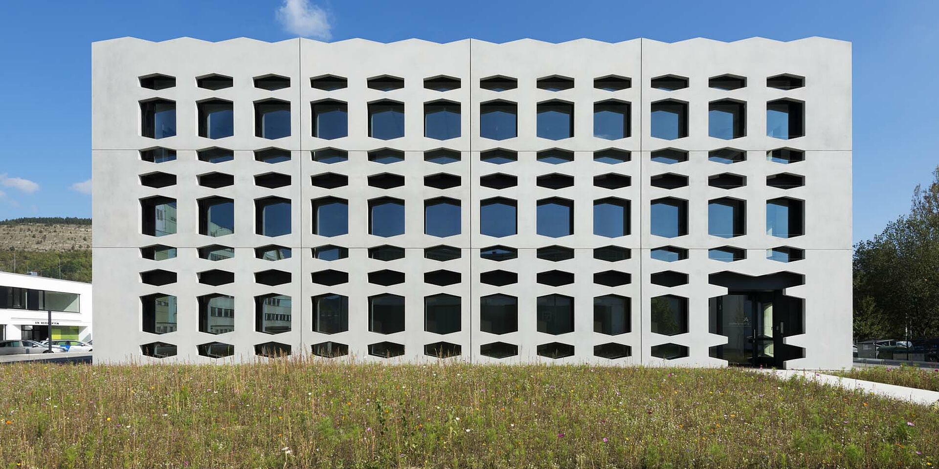Nach Rückbau der Bestandsfassade und Erstellung des inneren Tragwerkes wurde das Gebäude mit einer ersten Fassadenschicht aus raumhohen Fensterelementen und Aluminiumpaneelen geschlossen. Dieser raumabschließenden Ebene wurde eine weitere Hülle aus Betonfertigteilen vorgestellt. Diese zieht sich als perforierte Wand, wie ein vorgestellter Schirm, um das Gebäude. Der Solidität des Materials Beton zum Trotz wirkt das Gebäude weiterhin leicht. Das strenge Muster der Fensteröffnungen, die Wand durchbrechend, und die weit zurückliegenden Fenster lassen an einen Scherenschnitt denken. Der traufseitig gezahnte und giebelseitig überhöht vom Bestand übernommene Dachabschluss geben dem Gebäude trotz aller Strenge etwas verspieltes.